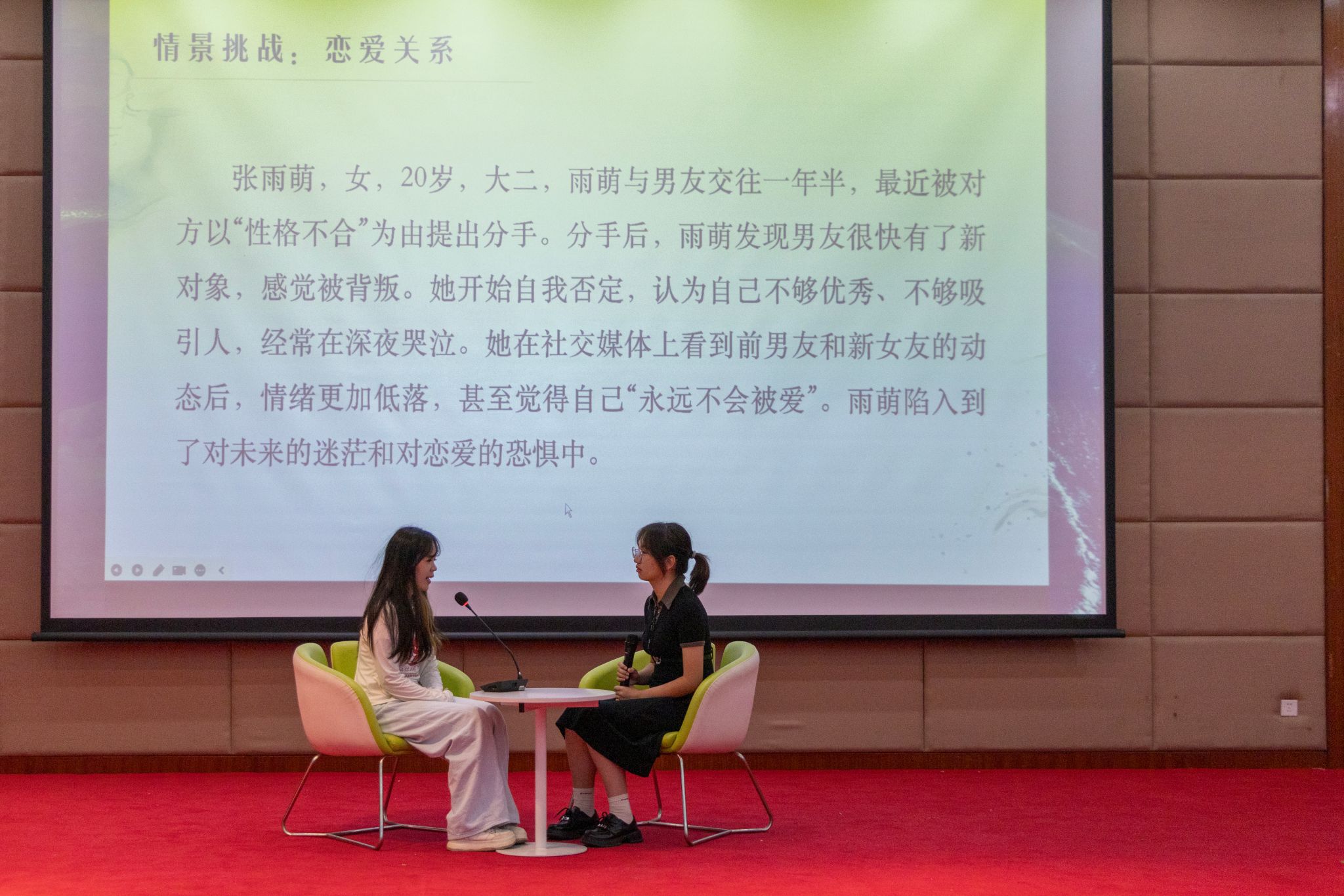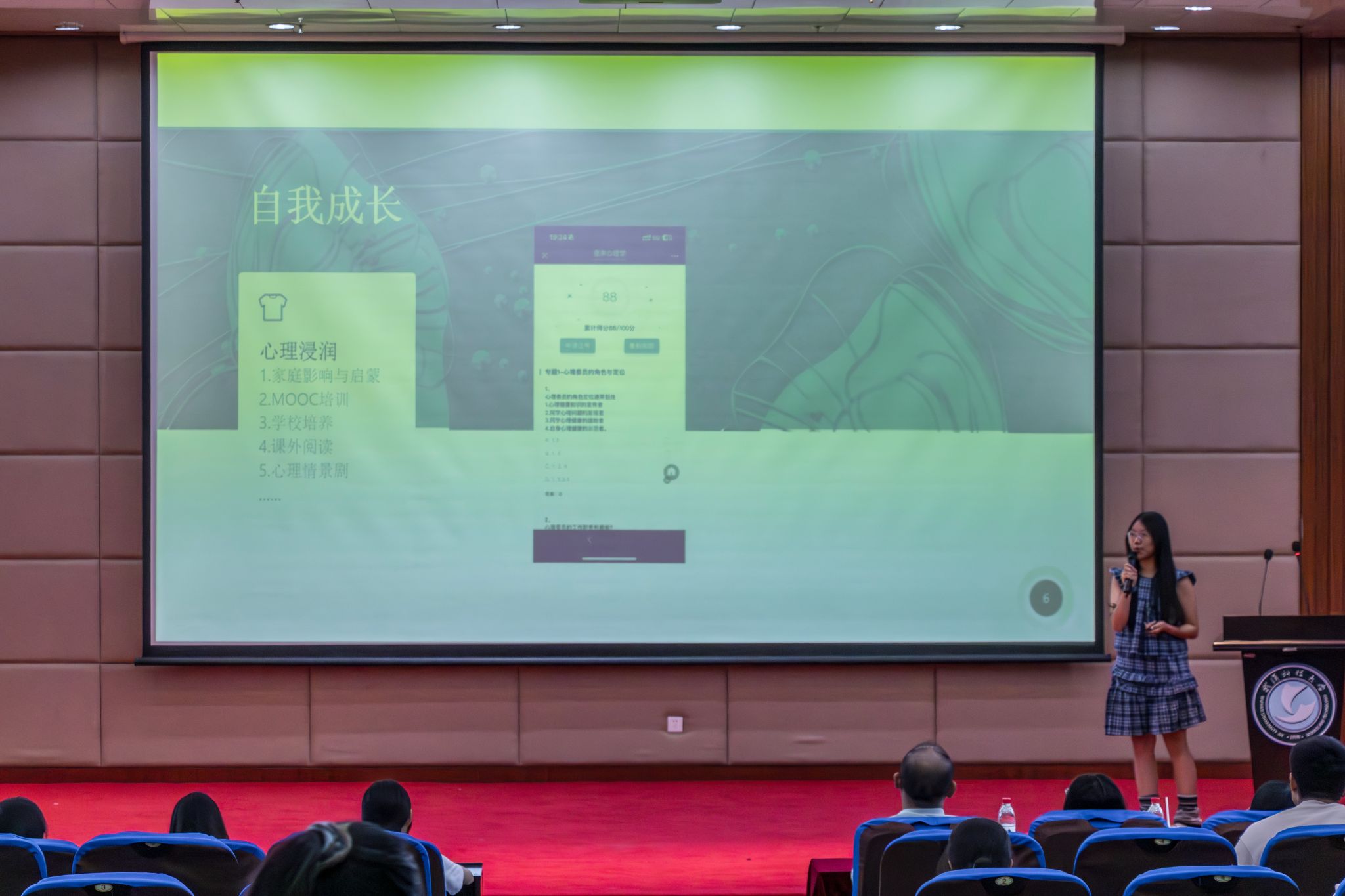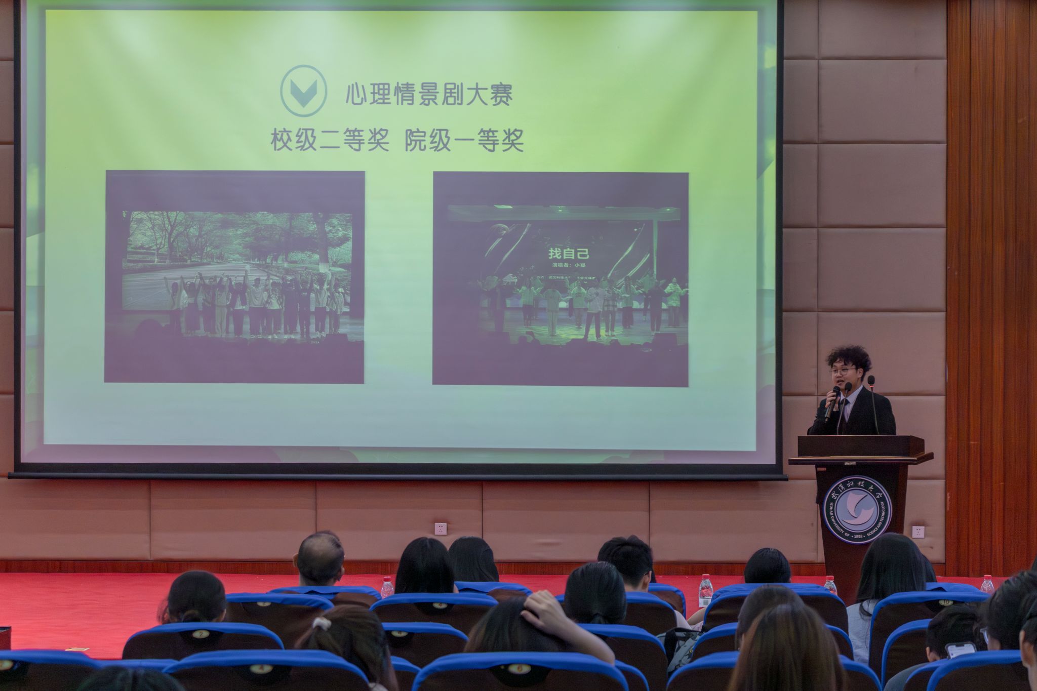 5月28日晚上19点至21点,365完美体育第七届心理委员技能大赛于365完美体育黄家湖校区图书馆二楼崇实会堂举行。首先,七位参赛选手进行风采展示并由本次比赛评委打分,中场有吉他音乐协会带来歌曲《传奇》,然后,各位选手抽签进行情景挑战,接着吉他音乐协会带来歌曲《字字句句》。最后,主持人宣读各位选手最终得分并进行颁奖仪式。
