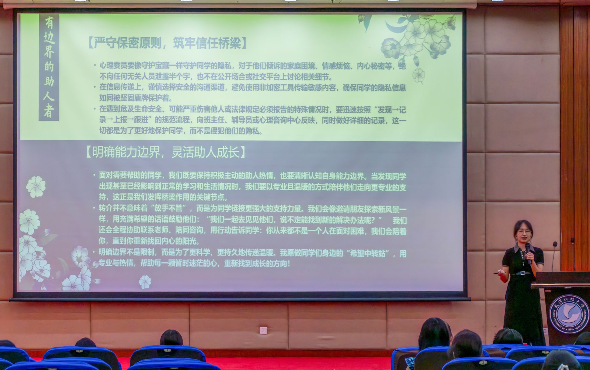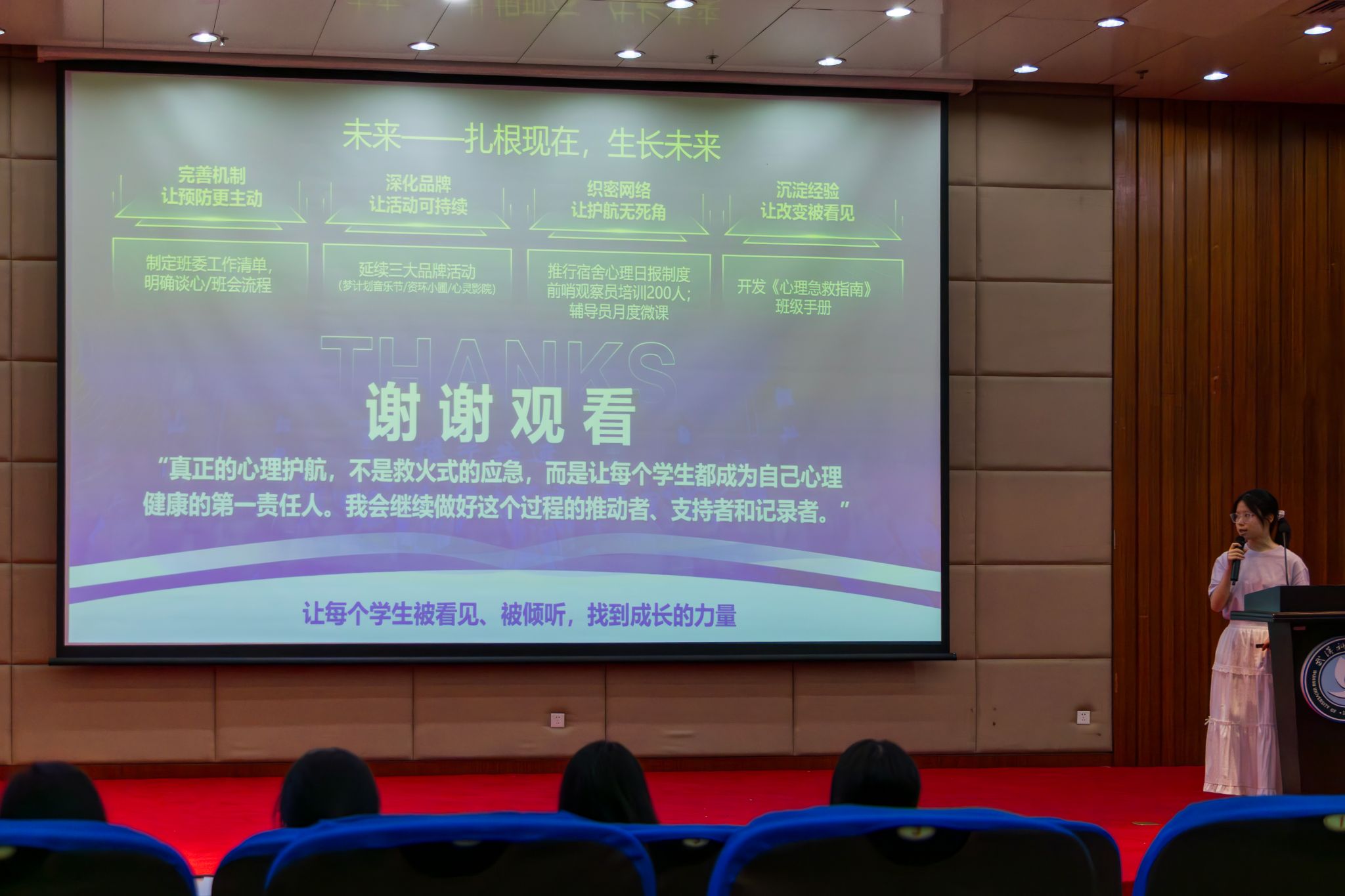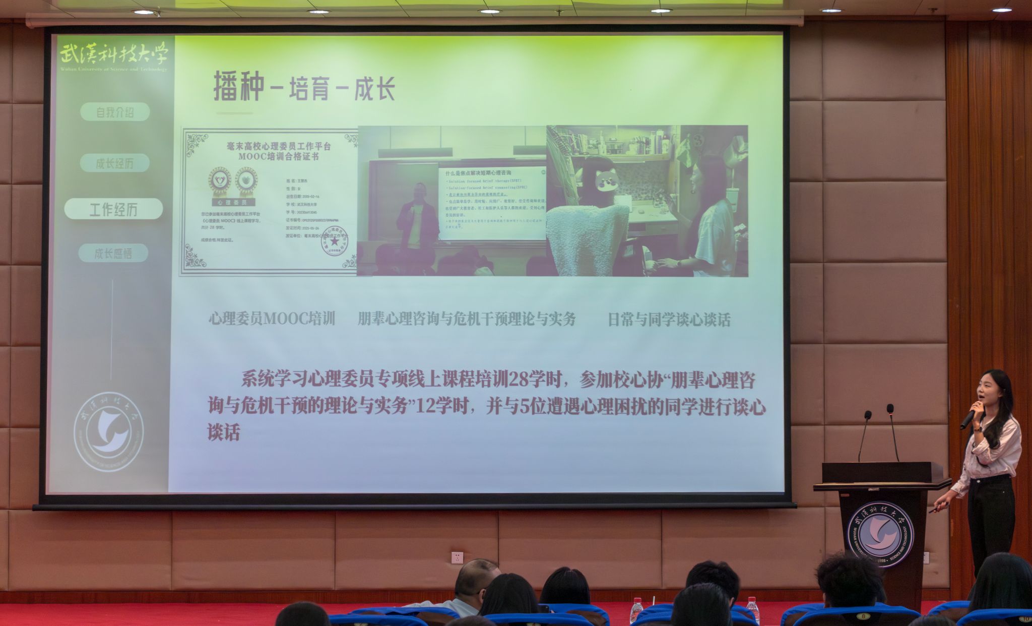 5月28日晚上19点至21点,365完美体育第七届心理委员技能大赛于365完美体育黄家湖校区图书馆二楼崇实会堂举行。首先,七位参赛选手进行风采展示并由本次比赛评委打分,中场有吉他音乐协会带来歌曲《传奇》,然后,各位选手抽签进行情景挑战,接着吉他音乐协会带来歌曲《字字句句》。最后,主持人宣读各位选手最终得分并进行颁奖仪式。