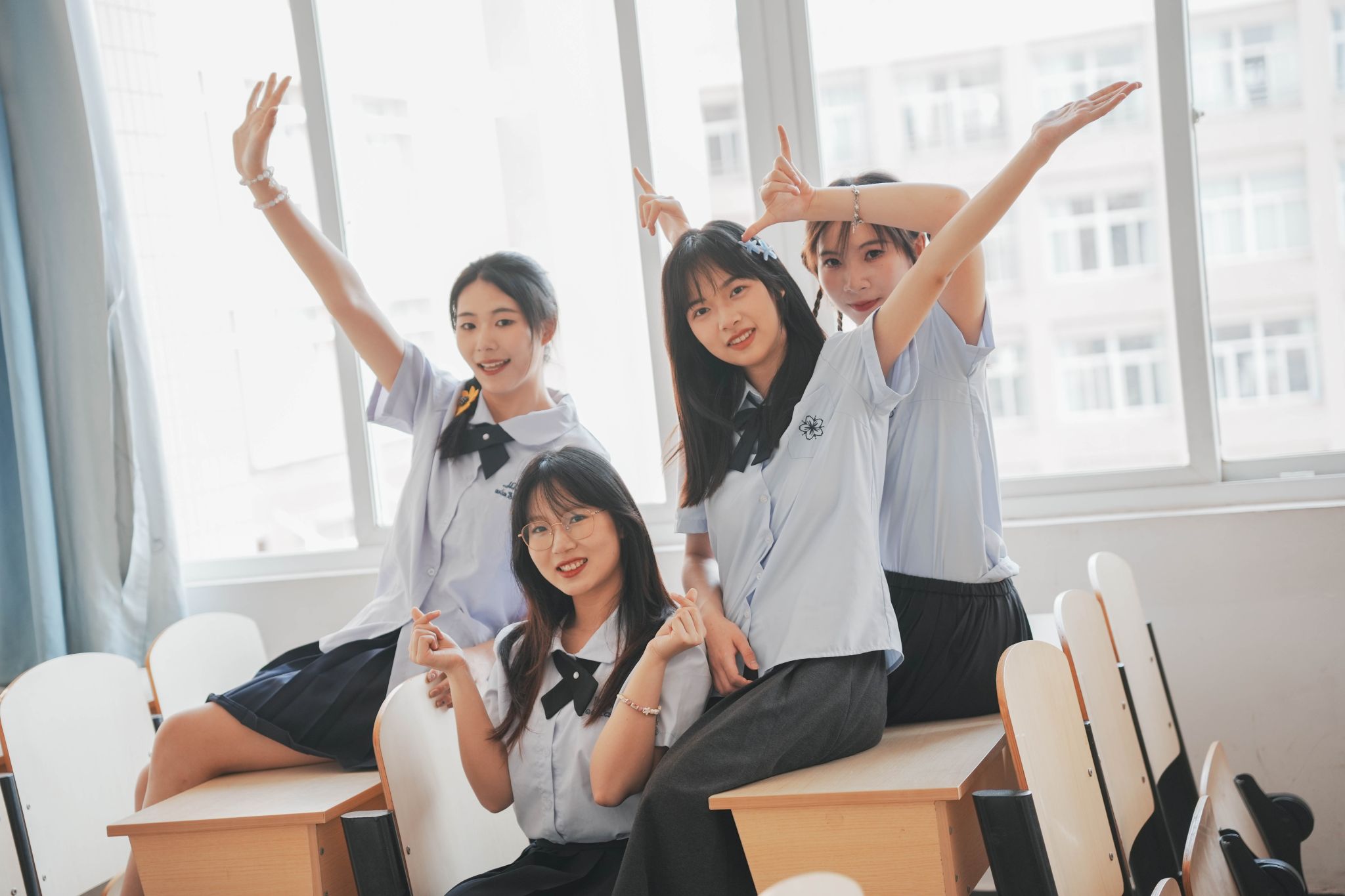 教室坐桌子上合照 陈薏帆摄