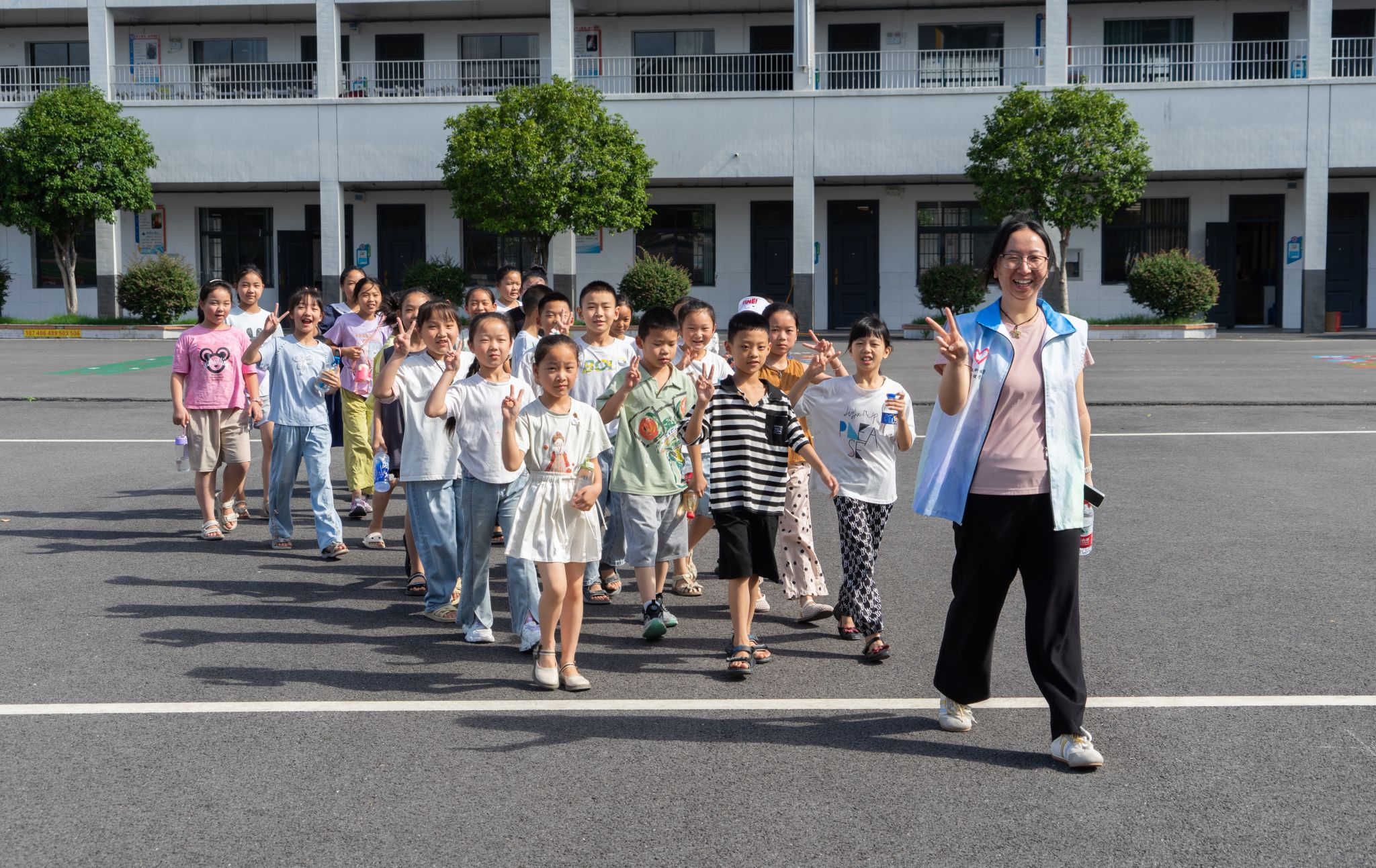 总结汇演前志愿者带班上小朋友前往汇演地点 周子轩摄