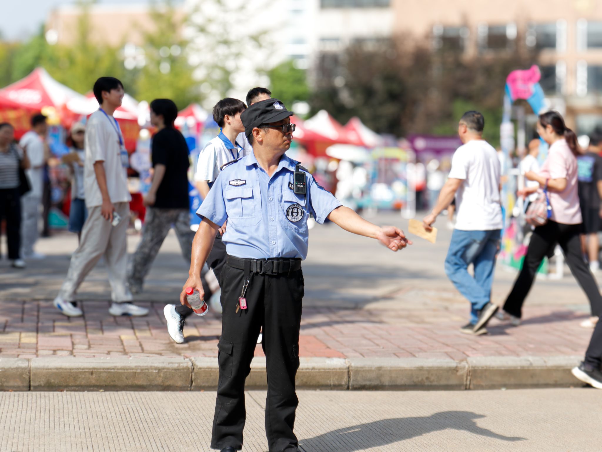 烈日下指挥车辆的安保人员 王铭浩摄