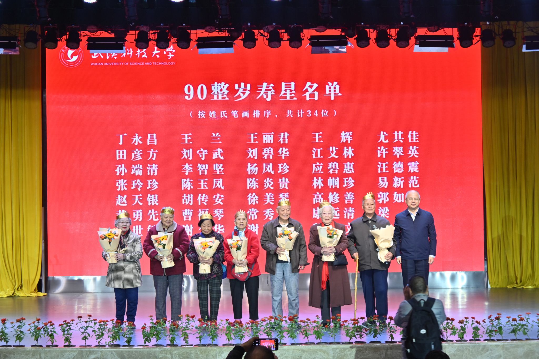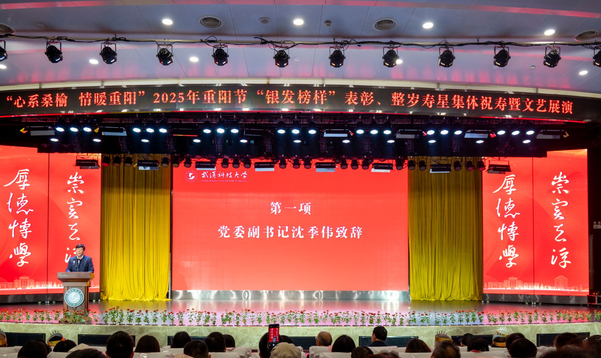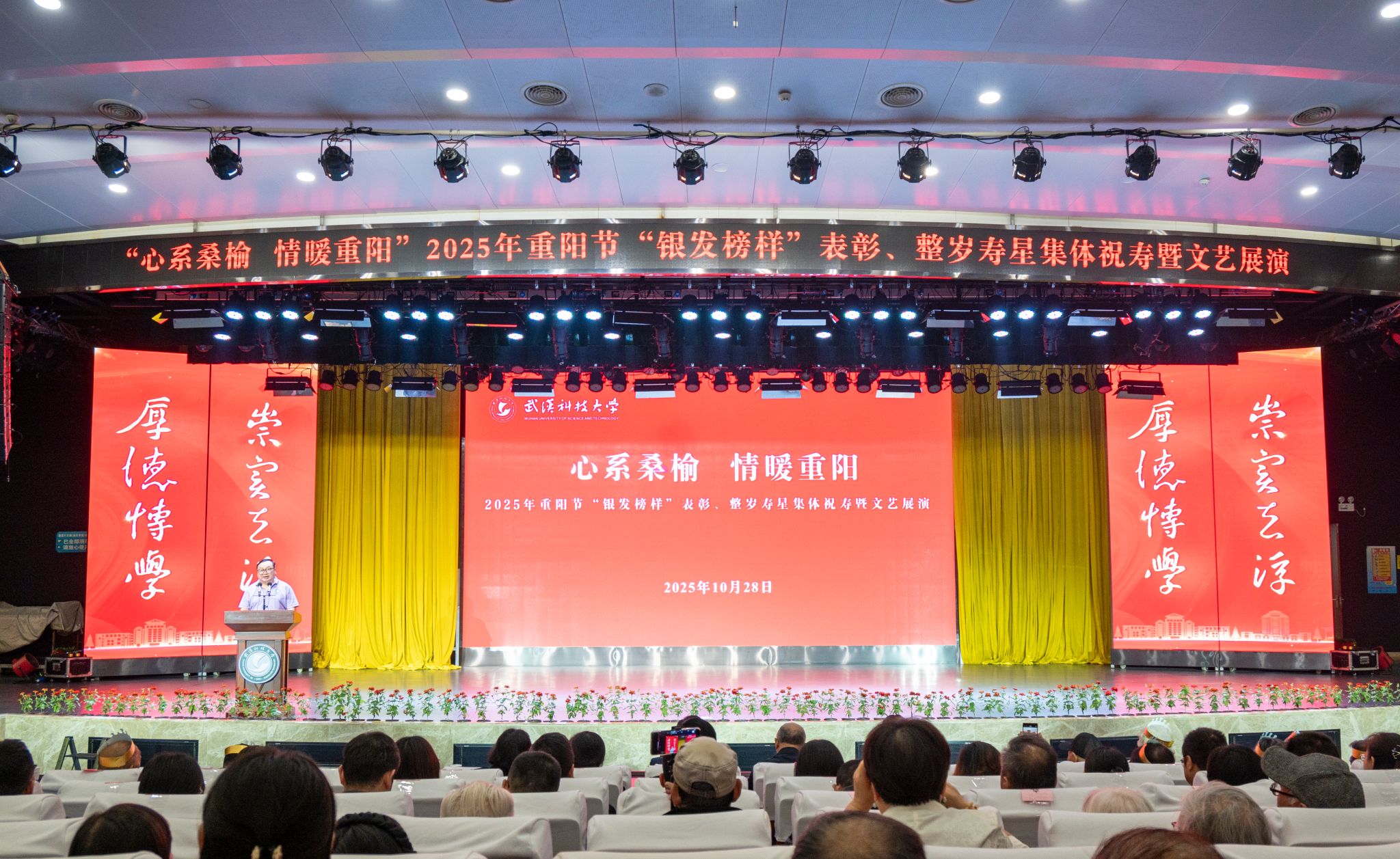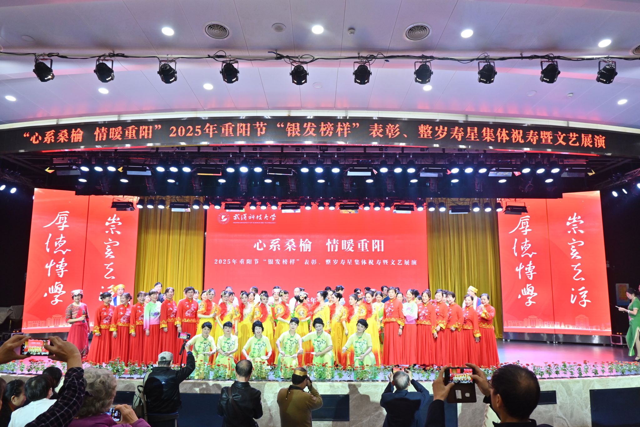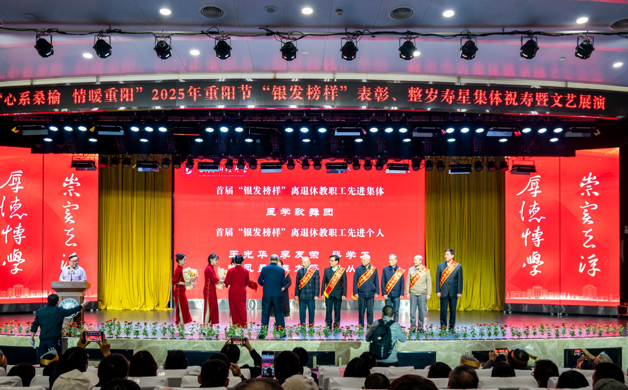 10月28日上午,学校在青山校区碧园会堂举行“银发榜样”表彰仪式暨重阳节集体祝寿活动,现场表彰首届“银发榜样”离退休教职工先进集体、个人,校领导为整岁寿星祝寿。文艺展演环节,京剧表演、湖北小板、时装秀等表演丰富多样、精彩纷呈。