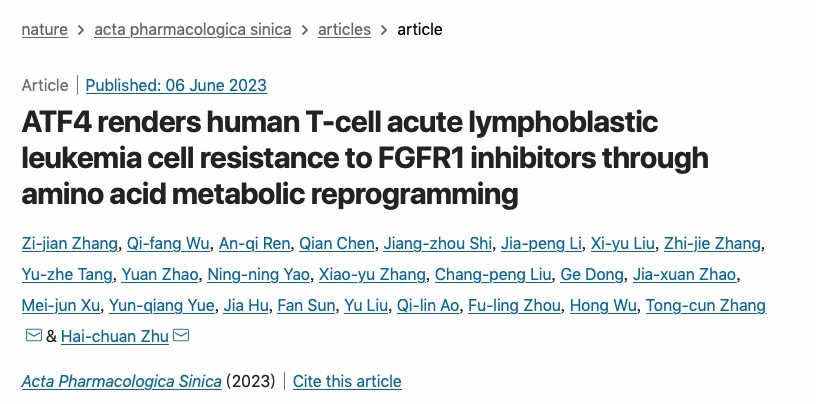 武科大网讯 6月9日,生命科学与健康学院张同存教授/祝海川副教授课题组在Acta Pharmacologica Sinica(中科院一区, 药学Top期刊)杂志上,发表题目为“ATF4 renders human T-cell acute lymphoblastic leukemia cell resistance to FGFR1 inhibitors through amino acid metabolic reprogramming”的研究论文。