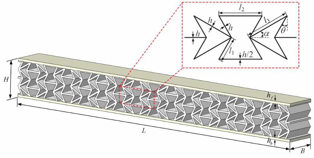 团队通过将该新型蜂窝超材料应用到夹芯结构中,开展新型夹芯梁的三点弯曲响应与能量吸收机理研究,再获成果,以 “Three-point bending response and energy absorption of novel sandwich beams with combined re-entrant double-arrow auxetic honeycomb cores”为题发表在力学领域国际权威期刊《Composite Structures》(IF:6.30, 中科院一区Top期刊)上。该论文第一作者为硕士生王慧玲,第二作者为邵俊华教授,张威老师为论文的通讯作者。