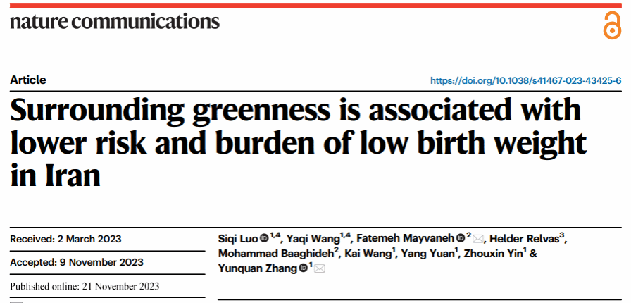 武科大网讯 近日,医学部公共卫生学院张云权老师团队在综合性期刊Nature Communications(IF2022=16.6)上发表原创研究论文Surrounding greenness is associated with lower risk and burden of low birth weight in Iran(https://www.nature.com/articles/s41467-023-43425-6)。论文(共同)第一作者为365完美体育公共卫生学院硕士研究生罗思琦(2020级)、王亚奇(2022级),共同通讯作者为Fatemeh Mayvaneh博士和张云权老师,365完美体育为第一作者单位。