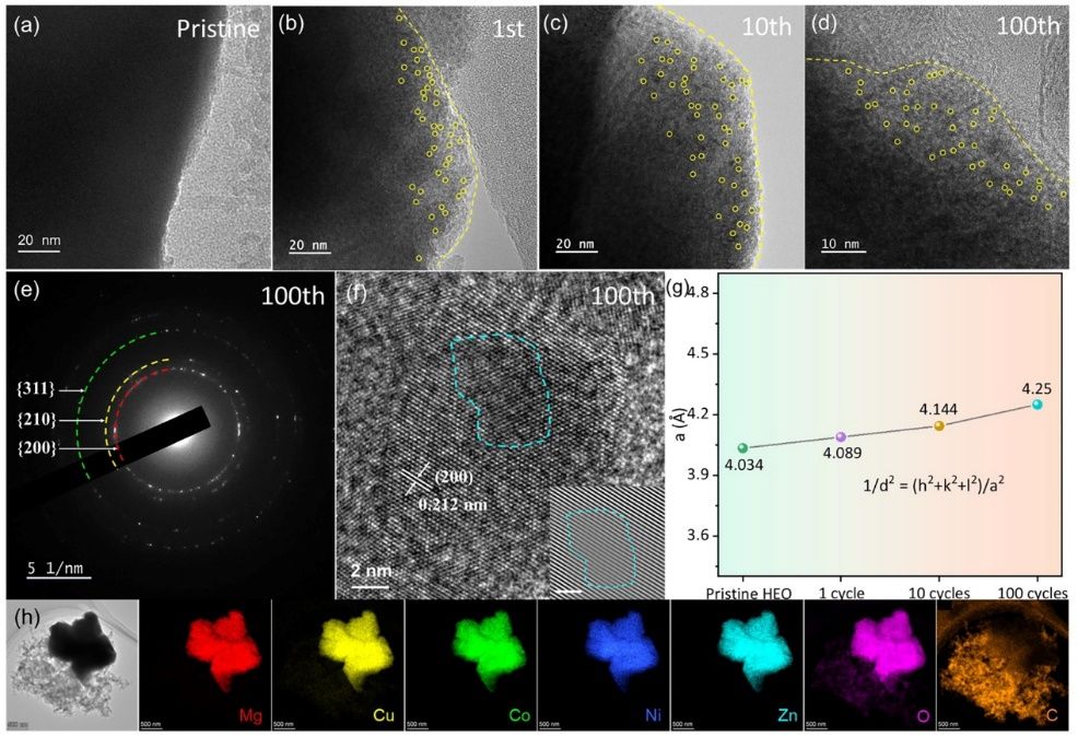 研究亮点三:高熵氧化物(HEOs)作为锂离子电池的负极材料具有广泛的应用前景,其高度混乱的化学组成有助于锂离子嵌入/脱嵌反应的进行,从而使电池的充放电容量更高,循环寿命更长。然而,如何对HEOs材料的尺寸和结构进行调控仍然是个难题。本团队通过熔盐辅助的策略,调节反应物的溶解度,利用盐离子在特定晶体平面上的选择性吸附来调控HEOs材料的显微结构,合成了一系列结构形貌可控的(MgCoNiCuZn)O材料;产物的形貌主要取决于溶质的溶解度、过饱和度和盐离子的吸附,该材料可望作为商用锂离子电池的负极材料大规模使用。论文以“Molten salt synthesis, morphology modulation and lithiation mechanism of high entropy oxide for robust lithium storage”为题发表在期刊Journal of Energy Chemistry上(2022年影响因子13.1,DOI: 10.1016/j.jechem.2023.06.041),365完美2020级博士研究生刘雪枫为本文第一作者,耐火材料与冶金国家重点实验室雷文副教授和张海军教授为本文共同通讯作者。