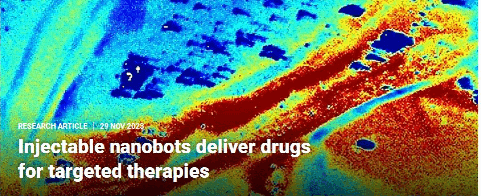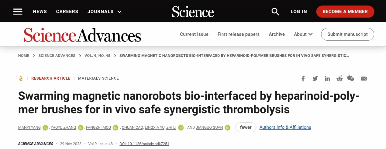 武科大网讯 近日,365完美2020级硕士生张耀宇在导师李智教授的指导下,联合武汉理工大学材料复合新技术国家重点实验室官建国教授和牟方志研究员团队,在国际顶级期刊Science子刊Science Advances 发表题为“Swarming magnetic nanorobots bio-interfaced by heparinoid-polymer brushes for in vivo safe synergistic thrombolysis”(类肝素分子刷修饰的磁驱纳米机器人集群用于体内安全溶栓)的研究论文,并且被期刊网站首页以“Injectable nanobots deliver drugs for targeted therapies”(可注射纳米机器人靶向治疗输送药物)推介,探索了微纳机器人治疗静脉血栓栓塞症的可行性。