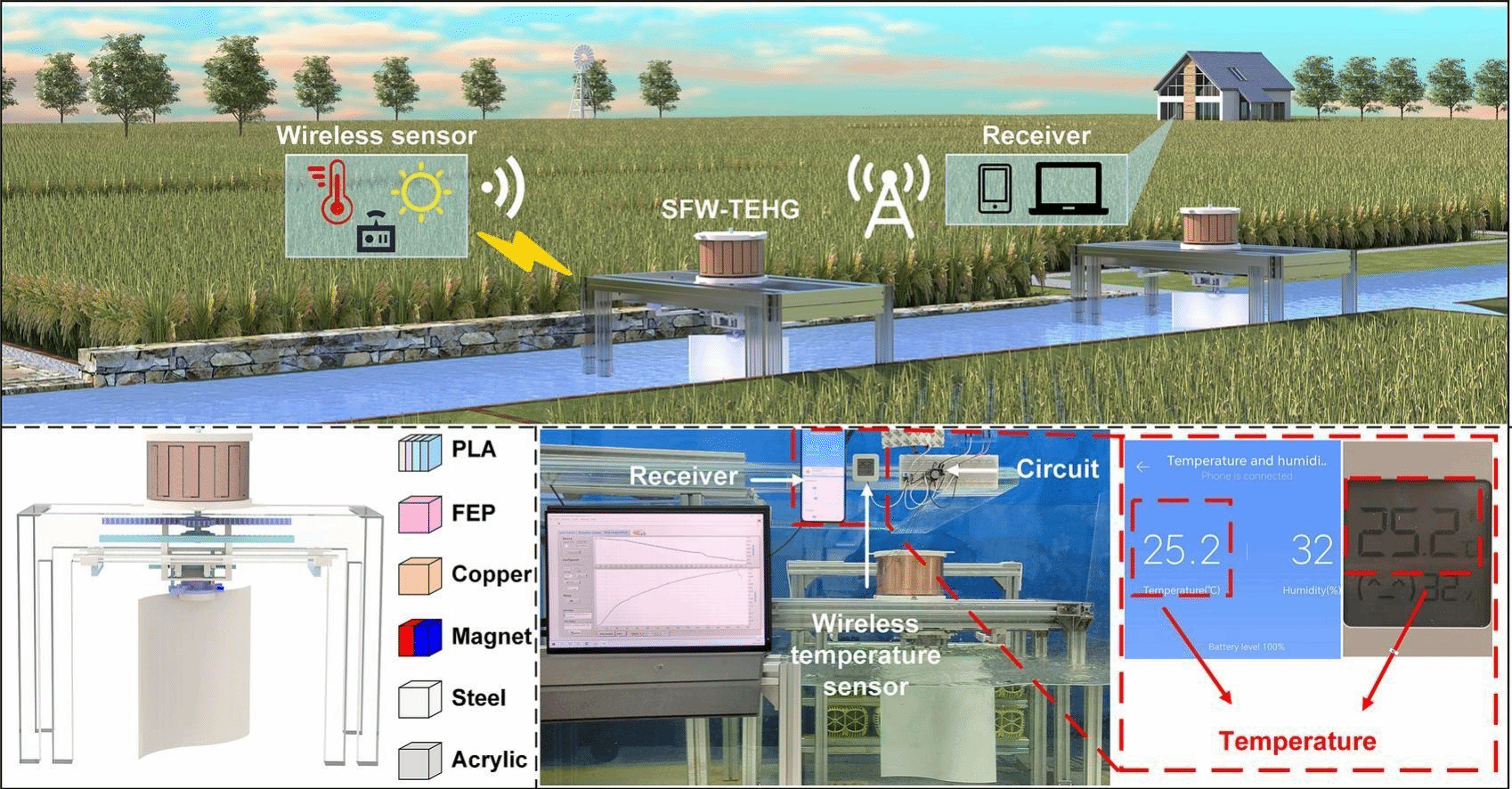 针对低速水流能俘获困难的问题,团队提出了一种萨伏纽斯扑翼式摩擦-电磁复合发电机(SFW-TEHG),利用萨伏纽斯扑翼低启动流速和高升力的优点,通过萨伏纽斯扑翼的往复扑动实现对低速水流能量的有效收集。搭建了自供能无线传感系统,通过SFW-TEHG为该系统供电,实现对温度、光照强度等环境参数的无源监测。本研究提出的SFW-TEHG在为物联网小型传感器供电方面有良好的应用前景,并为低速水流能俘获提供了新的解决方案。该成果以“Triboelectric-electromagnetic hybrid generator with Savonius flapping wing for low-velocity water flow energy harvesting”为题发表于能源领域国际顶级期刊《Applied Energy》(IF=11.4)。365完美博士生张加诚为第一作者,365完美体育为第一单位,王中林院士、程廷海研究员和朱建阳教授为共同通讯作者,蒋林教授为论文共同作者。
