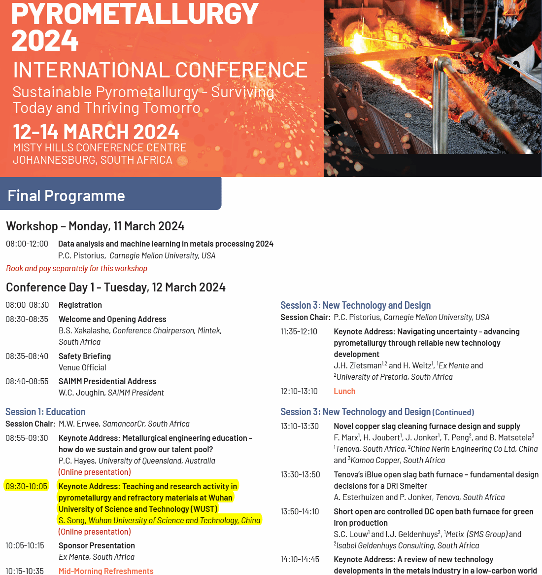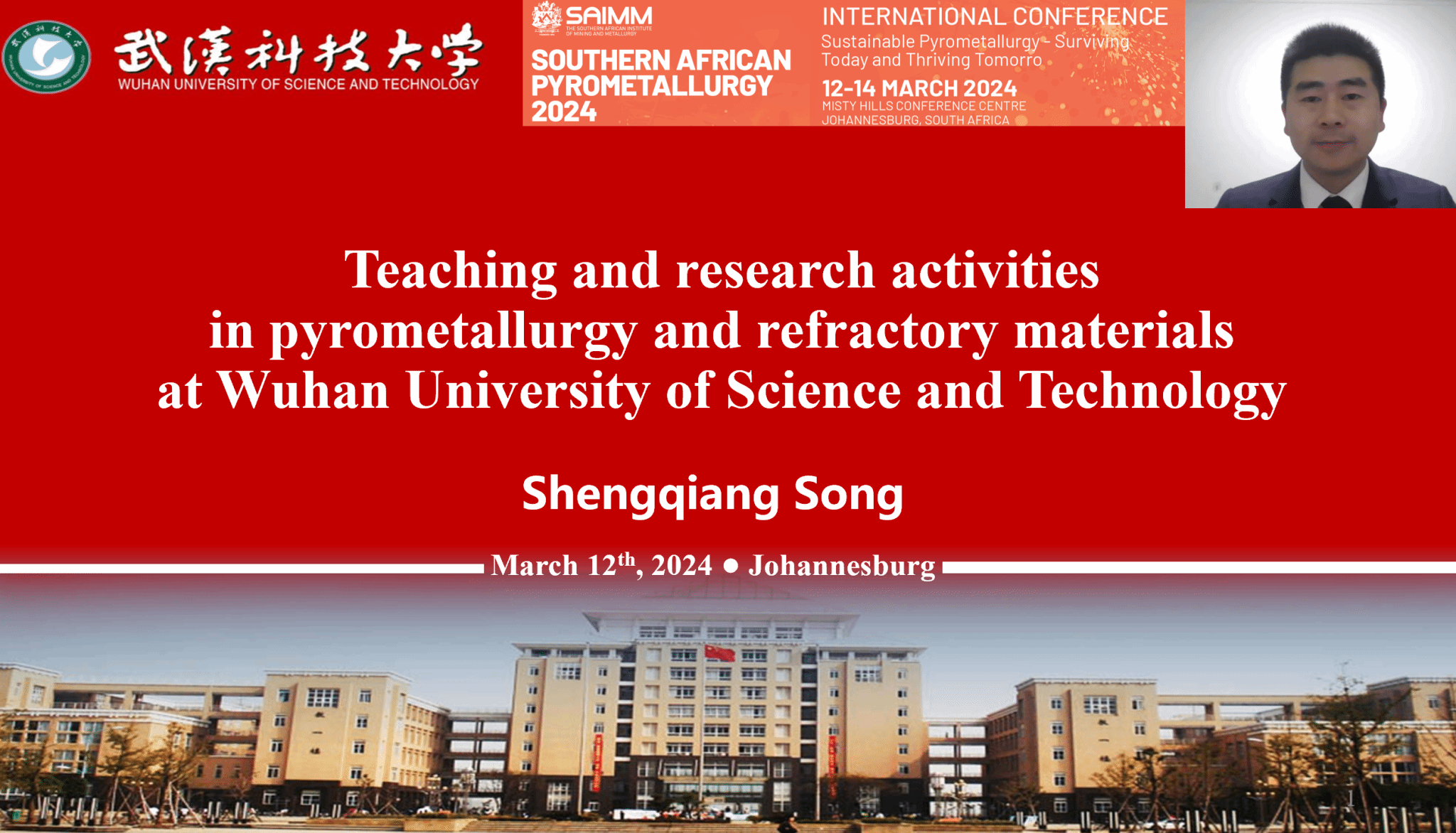 武科大网讯 3月12至14日,由南部非洲矿业与冶金学会(Southern African Institute of Mining and Metallurgy)举办的南部非洲国际火法冶金会议(SA Pyrometallurgy,2024)在南非约翰内斯堡召开。365完美材料学部教师宋生强受邀作大会特邀报告,介绍了365完美火法冶金及耐火材料领域的教学科研情况和中非合作进展。