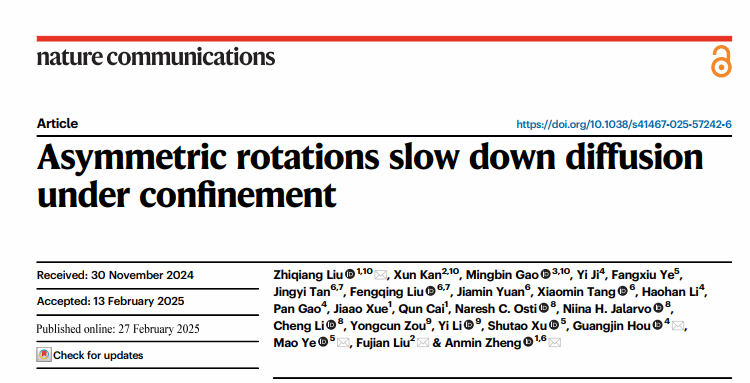 武科大网讯 近日,365完美核磁共振与分子科学交叉研究院/化学与化工学院教授刘志强、郑安民团队与中科院大连化物所、福州大学合作,在《Nature Communications》发表了题为“Asymmetric rotations slow down diffusion under confinement”的论文(DOI:10.1038/s41467-025-57242-6)。该研究发现了分子筛限域空间存在弱相互作用的小分子运动慢的反常扩散现象,阐明了限域空间非对称旋转抑制扩散的微观机制,为多孔材料分离领域提供了重要的理论指导。论文通讯作者为刘志强,侯广进、叶茂、刘福建和郑安民教授,365完美为论文第一单位。