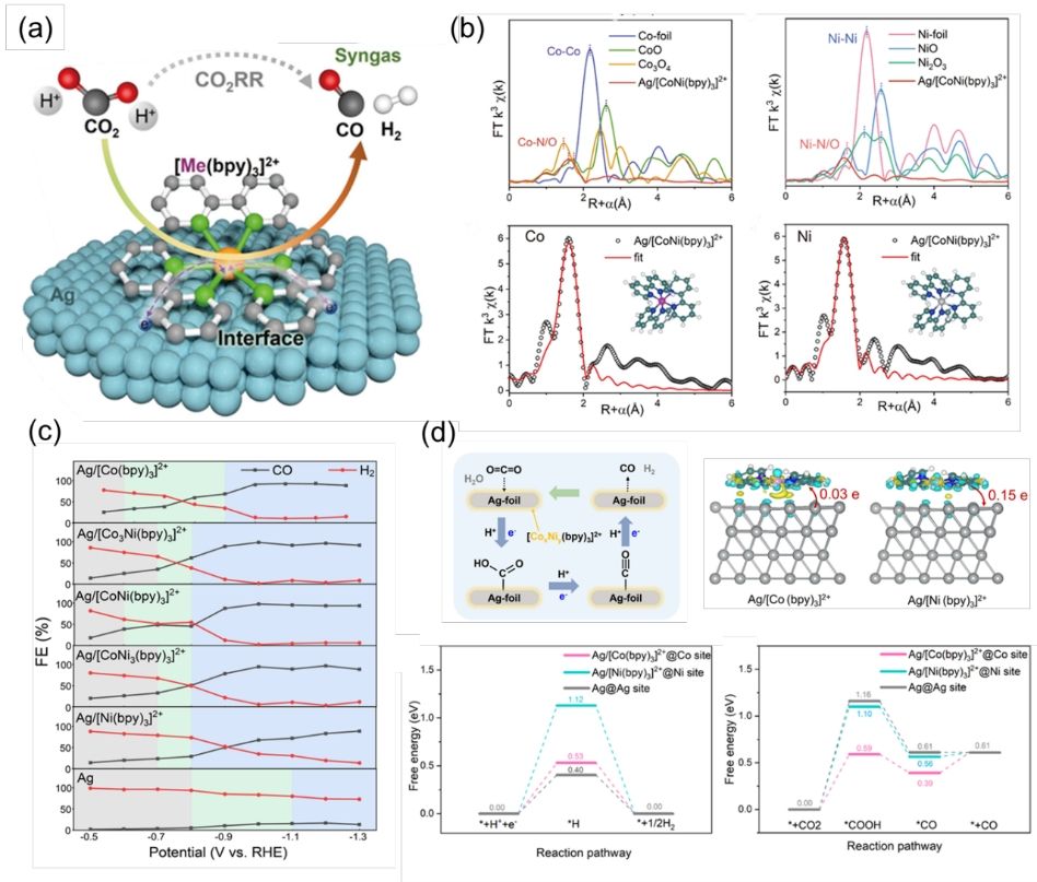 电催化CO₂还原技术是实现"双碳"目标的关键路径之一,其中合成气(H₂/CO)作为重要化工原料,其比例调控直接影响下游产品的生产效率。传统银基催化剂具备本征的电催化CO2还原为CO的活性,但存在反应活性低、竞争性析氢反应严重等瓶颈问题。针对上述挑战,研究团队开发课一种Ag/Co(Ni)-bpy复合催化剂,通过分子工程策略构建了原子级分散的CO2RR活性位点,利用金属-分子间的强电子耦合作用,实现了对反应中间体(*COOH)的调控,显著提升了催化选择性和稳定性。