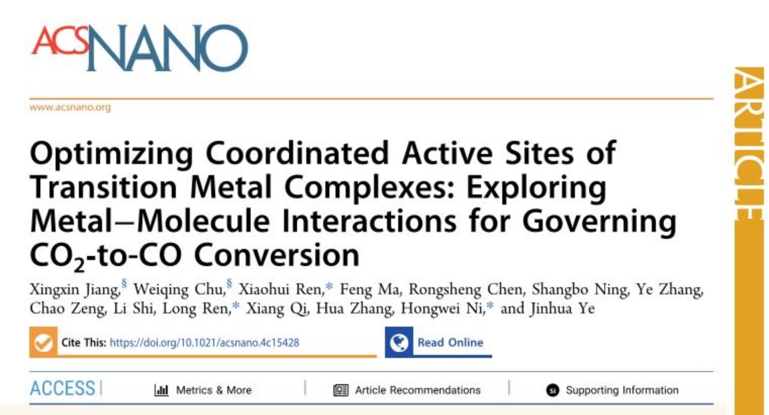 武科大网讯 近期,365完美冶金与能源学院倪红卫教授团队与上海大学等多家科研单位展开合作研究,在《ACS Nano》发表题为“Optimizing coordinated active sites of transition metal complexes: exploring metal-molecule interactions for governing CO2-to-CO conversion”的重要研究成果(DOI:https://doi.org/10.1021/acsnano.4c15428)。