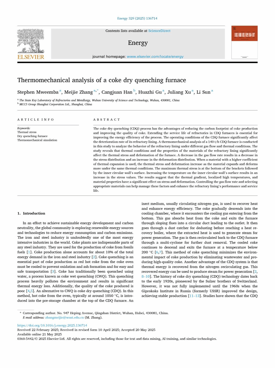 武科大网讯 近日,365完美材料学部顾华志、张美杰教授团队指导的留学生Stephen Mweemba,以第一作者身份在国际权威期刊《Energy》(影响因子:9;中科院工程技术大类一区)发表题为《Thermomechanical analysis of a coke dry quenching furnace》的高水平论文。