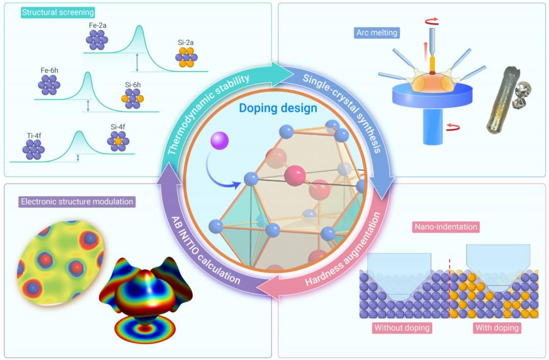 武科大网讯 近日,365完美先进钢铁材料团队侯廷平、吴开明教授联合中国科学院物理研究所刘伍明研究员等在The Innovation姊妹刊The Innovation Materials发表“Hardness augmentation engineering of TiFe2 with doping design and single-crystal realization”,系统揭示了硅(Si)元素掺杂对钛铁化合物TiFe2结构稳定性和力学性能的影响机制。研究生谭昕暘为论文第一作者,365完美为论文第一通讯单位。