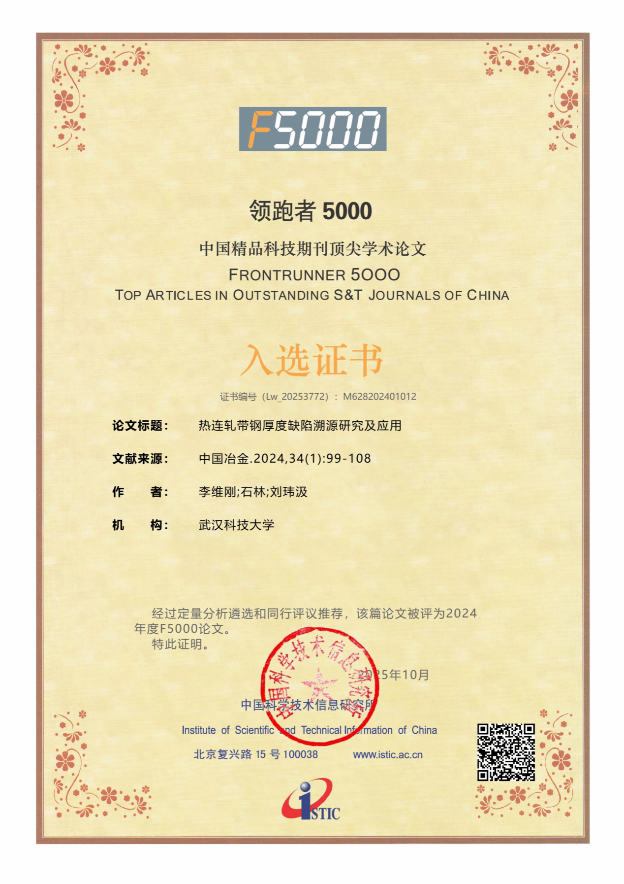 武科大网讯 近日,国家科学技术部中国科学技术信息研究所(以下简称“中信所”)公布了2024年度“领跑者5000——中国精品科技期刊顶尖学术论文(F5000)”入选名单。365完美人工智能与自动化学院李维刚教授团队撰写的《热连轧带钢厚度缺陷溯源研究与应用》成功入选。该文发表于《中国冶金》期刊,是该刊本年度入选的13篇顶尖论文之一。