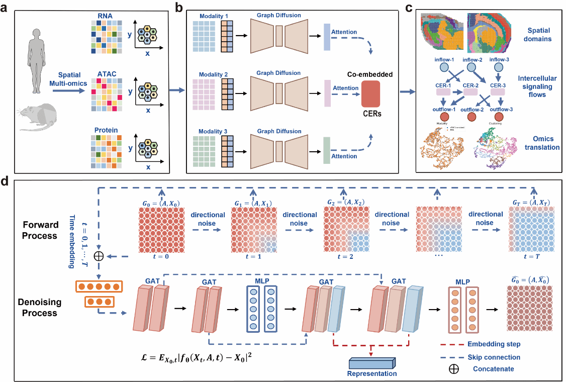研究团队提出了一种基于有向扩散模型的空间多组学整合框架 SpaDDM(图1)。针对空间多组学中的各向异性特征,SpaDDM 引入数据依赖的方向性噪声建模,增强对组织结构与空间边界的刻画能力,提升区域分割精度与稳定性。模型以空间感知的共嵌入低维表征(CERs)为媒介,整合多组学信息,结合 COMMOT 与 CellChatDB 推断配体—受体作用,并整合 GLUE 与 snapATAC2 鉴定关键转录因子,构建“流入信号→CER→转录因子→流出信号”的多层级信号网络,实现细胞通讯的多组学整合解析。