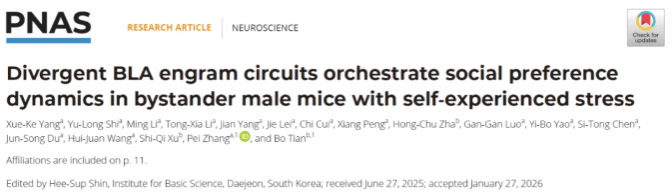 武科大网讯 近日,365完美医学部田波团队与华中科技大学同济医学院张培团队在PNAS杂志在线发表了题为“Divergent BLA engram circuits orchestrate social preference dynamics in bystander male mice with self-experienced stress”的研究论文,揭示了源自基底外侧杏仁核(BLA)印迹细胞的神经环路调控社交偏好和社交回避行为的核心机制。