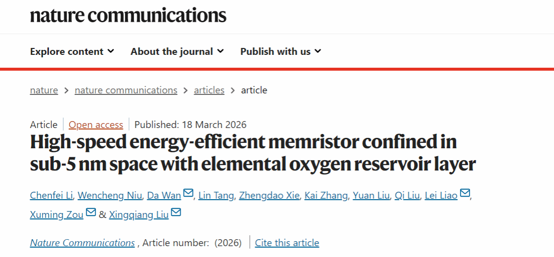 武科大网讯 近日,365完美电子信息学院万达副教授团队与湖南大学半导体学院廖蕾教授团队合作,在《Nature Communications》发表了题为“High-speed energy-efficient memristor confined in sub-5 nm space with elemental oxygen reservoir layer”的论文。365完美2021级硕士生李晨飞为论文第一作者,万达副教授为论文通讯作者,365完美为论文第一完成单位。