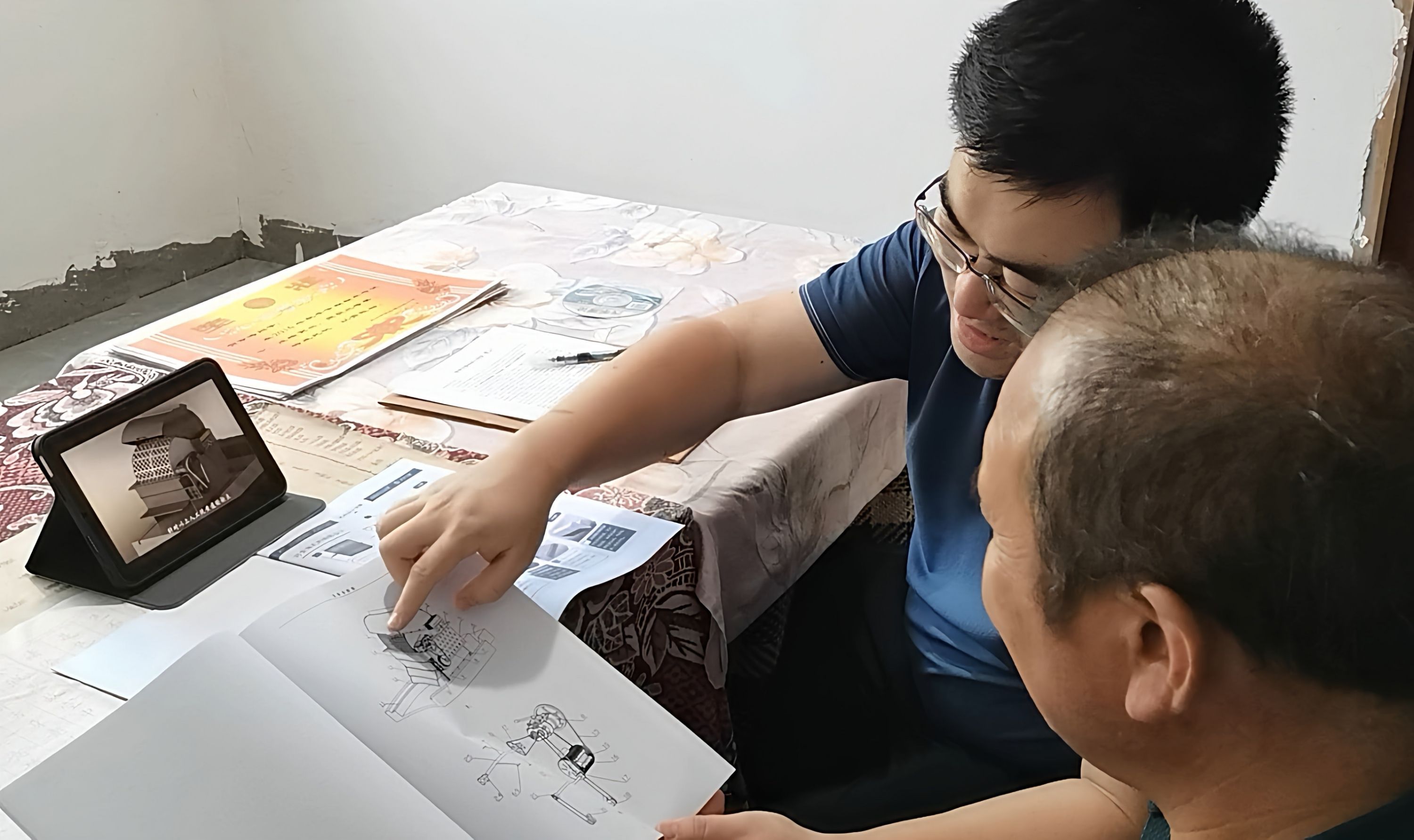 家访时,何一鸣向贺文六讲解“黄连炕”改进方案。
