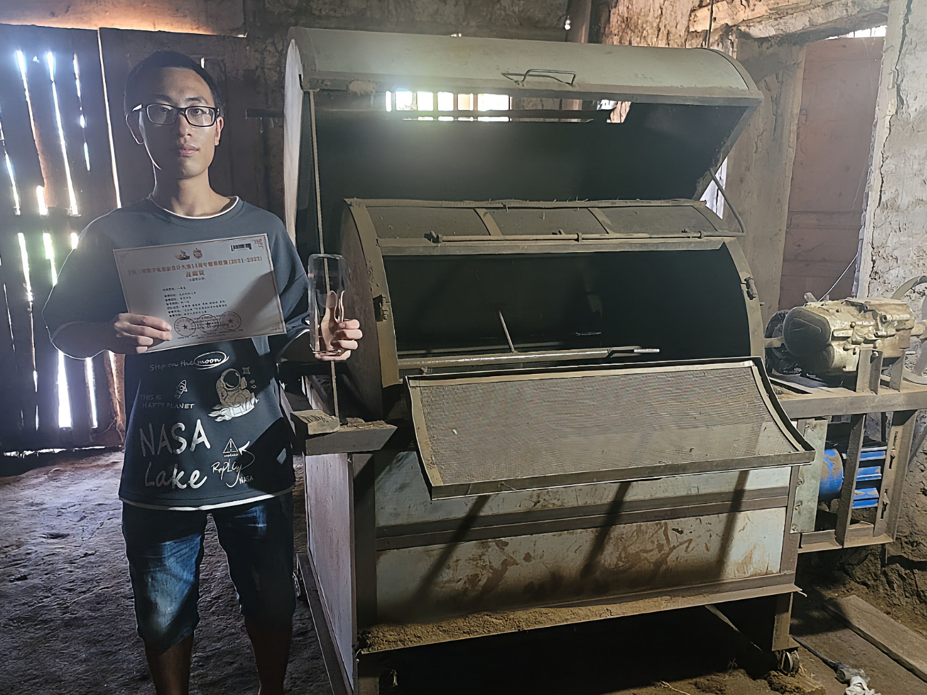 贺章涛从小就跟父母在黄连地里劳动,觉得父母很辛劳。即便如此辛苦,家里收获的黄连被炒煳也是常有的事。2020年,还在上高三的贺章涛凭着所学的物理知识,与父亲商量起改进炒制黄连的办法,让炒黄连不再又苦又累。他们买来钢材,在家使用焊机、切割机、角磨机等工具改造了一辆废旧摩托车的变速器,制作了一台自动翻炒黄连的机器——黄连炕。