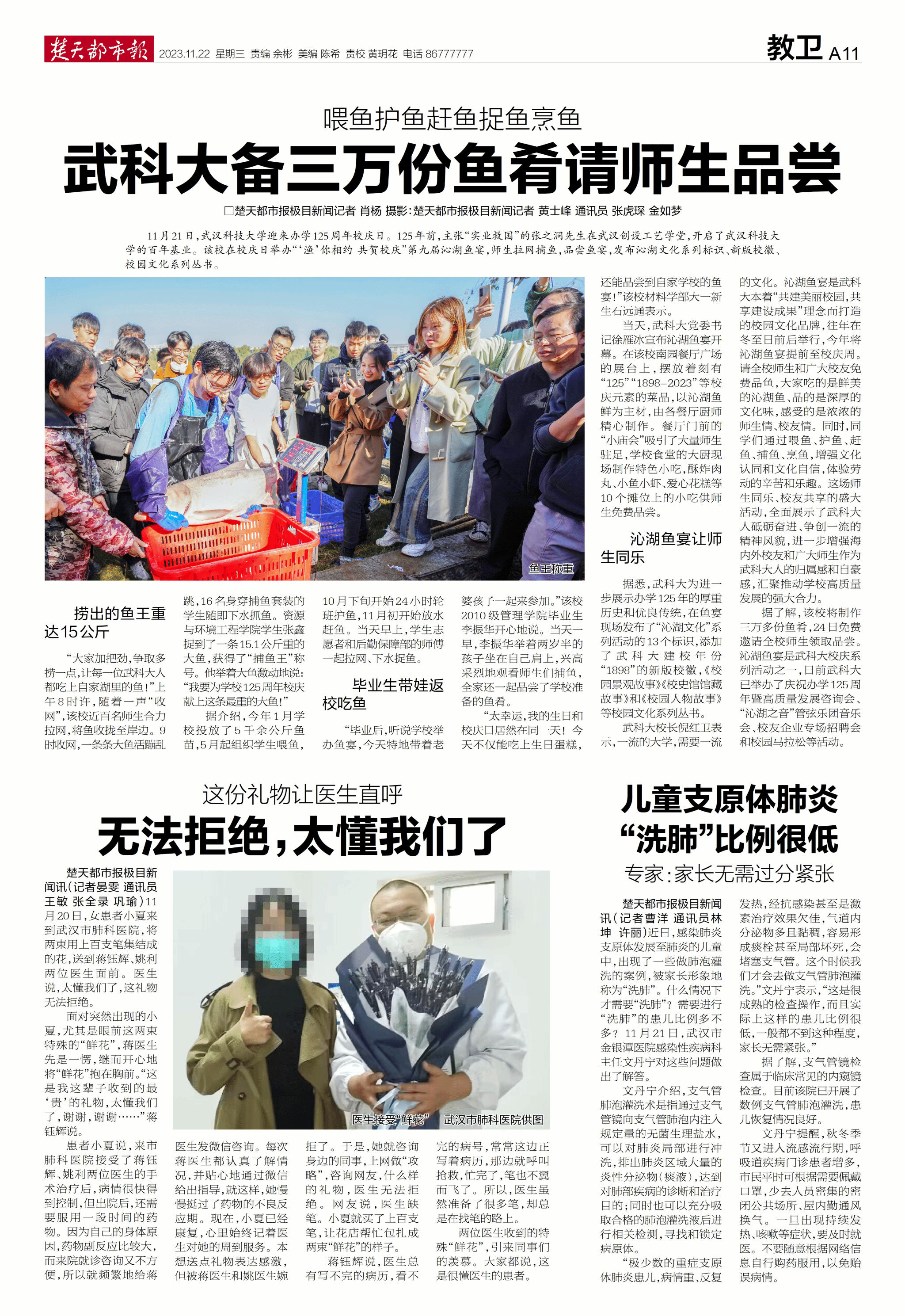 武科大校长倪红卫表示,一流的大学,需要一流的文化。沁湖鱼宴是武科大本着“共建美丽校园,共享建设成果”理念而打造的校园文化品牌,往年在冬至日前后举行,今年将沁湖鱼宴提前至校庆周。请全校师生和广大校友免费品鱼,大家吃的是鲜美的沁湖鱼、品的是深厚的文化味,感受的是浓浓的师生情、校友情。同时,同学们通过喂鱼、护鱼、赶鱼、捕鱼、烹鱼,增强文化认同和文化自信,体验劳动乐趣和劳动辛苦。这场师生同乐、校友共享的盛大活动,全面展示了武科大人砥砺奋进、争创一流的精神风貌,进一步增强海内外校友和广大师生作为武科大人的归属感和自豪感,汇聚推动学校高质量发展的强大合力。