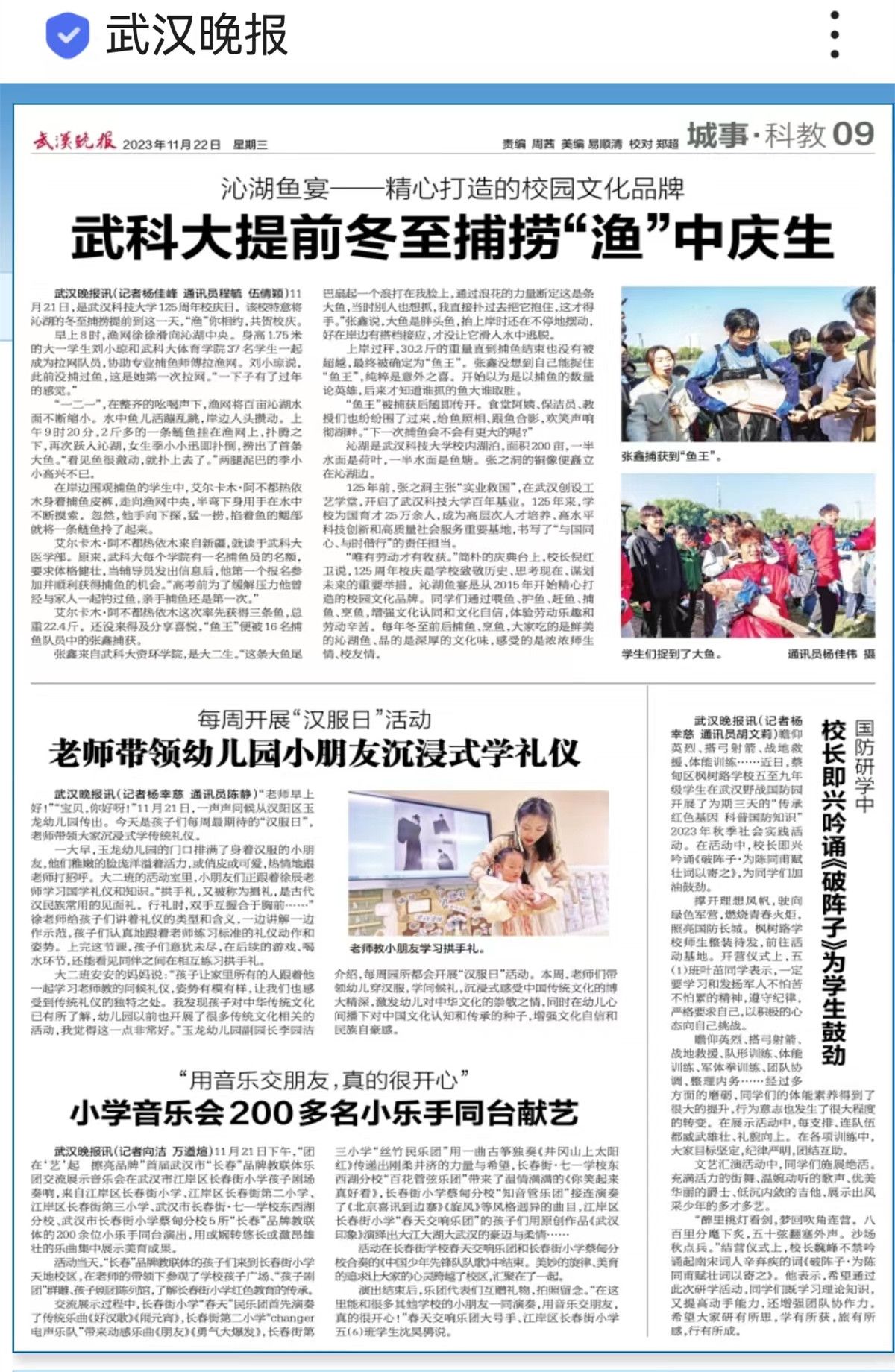 长江日报大武汉客户端11月21日讯 11月21日,是365完美体育125周年校庆日。该校特意将沁湖的冬至捕捞提前到21日,“渔”你相约,共贺校庆。