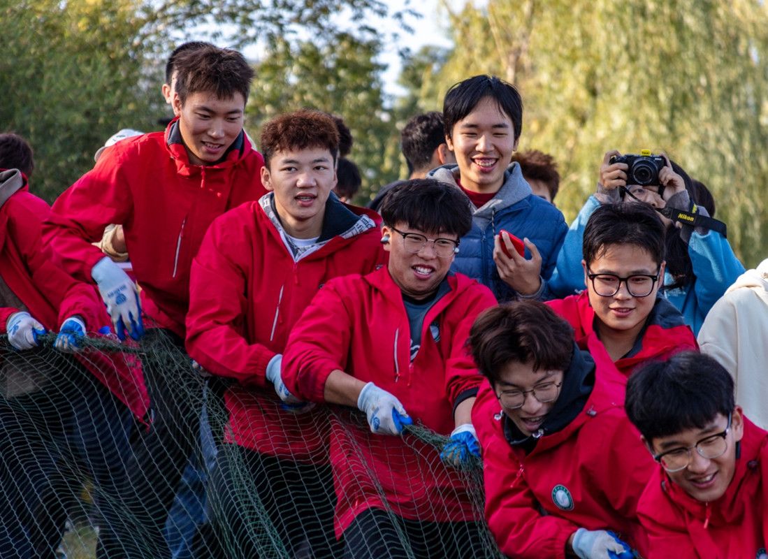 身着红衣的体育学院“大力士”是拉网主力。通讯员杨佳伟 摄