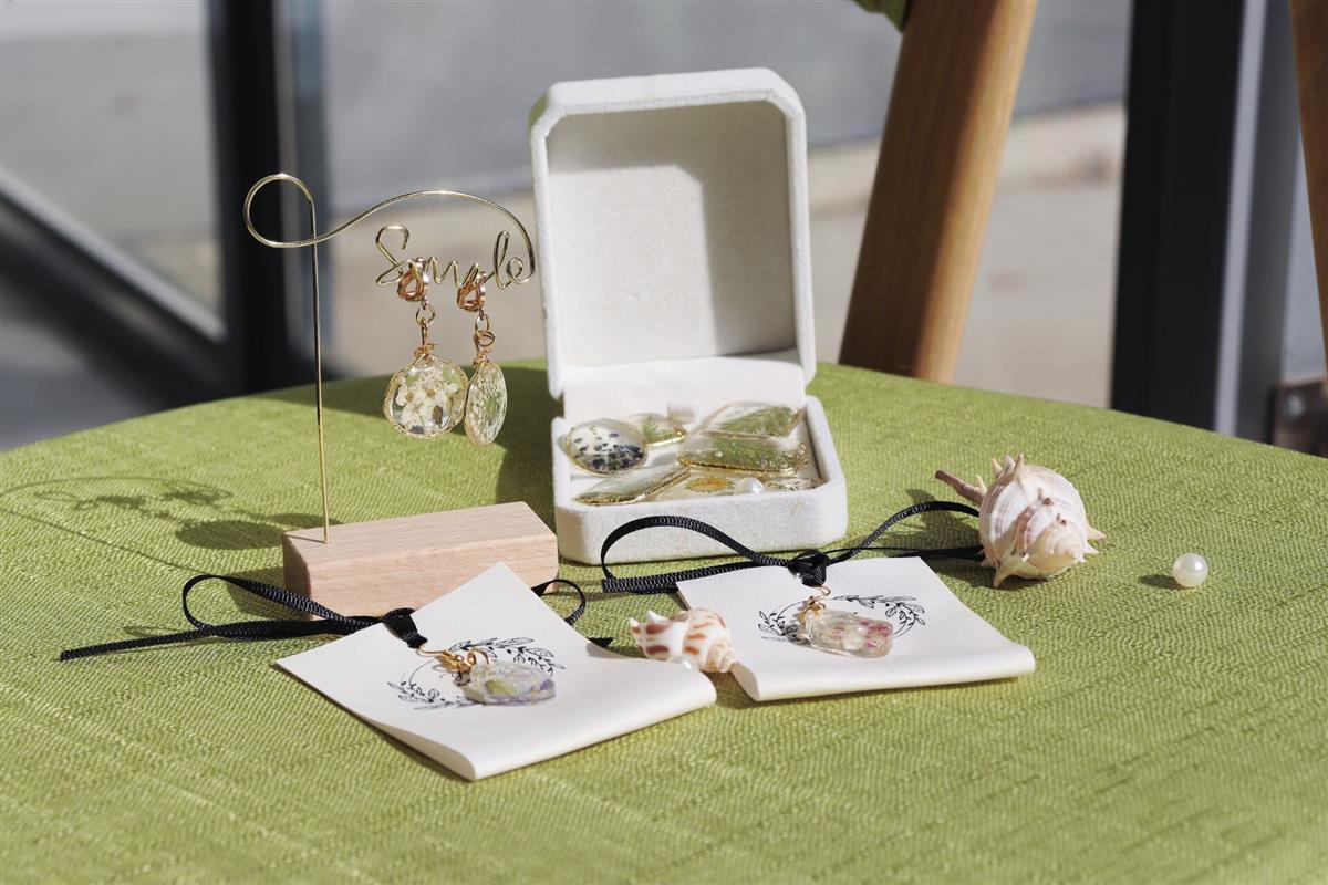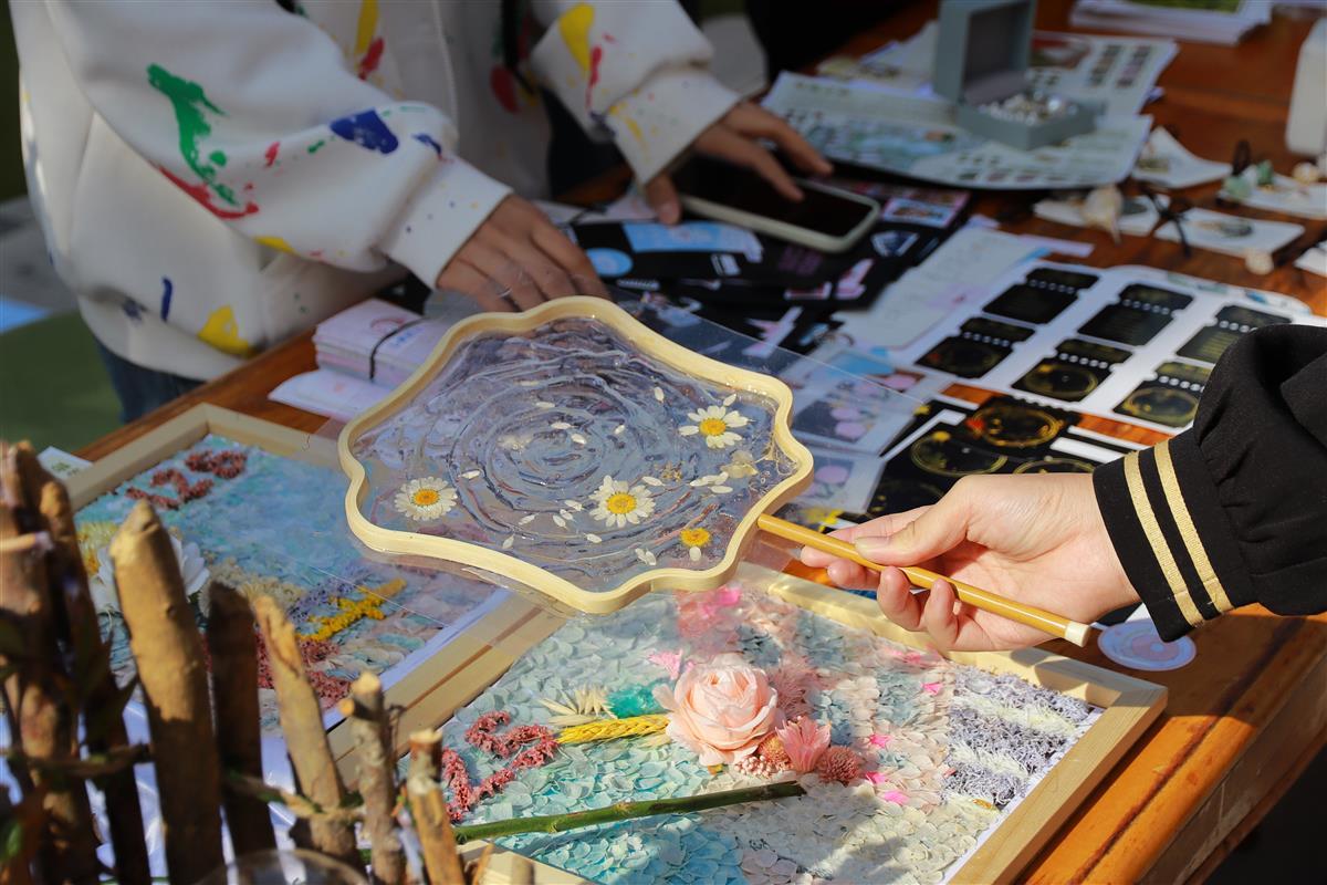 该系学生用植物制作而成的文创产品也在现场展出。学生韦佳媛用滴胶将绽放的花卉保存,搭配珍珠与贝壳制作成耳饰;刘如昊将滴胶封存的花朵制成扇面配上木质的扇骨,创作出独特的中国风团扇;学生石乙杰将传统的纸上拓印改良为用石膏拓印,她说:“石膏拓印可以在保留植物形象特征的基础上,用类似化石的形态为植物留下纪念。”