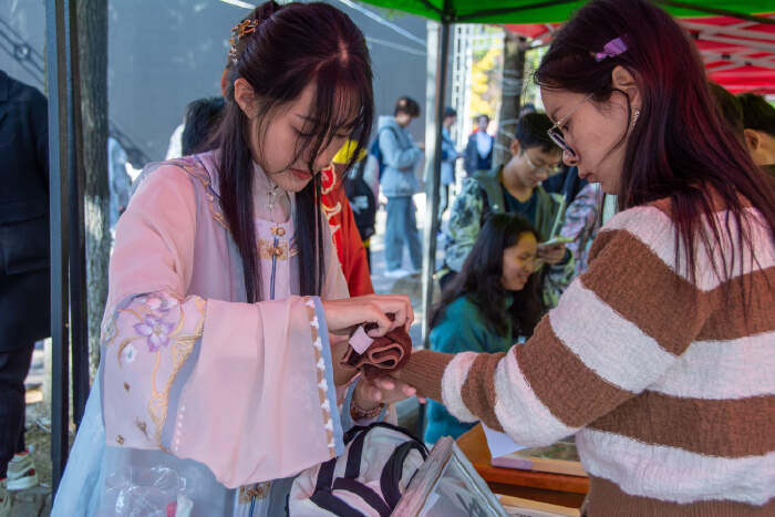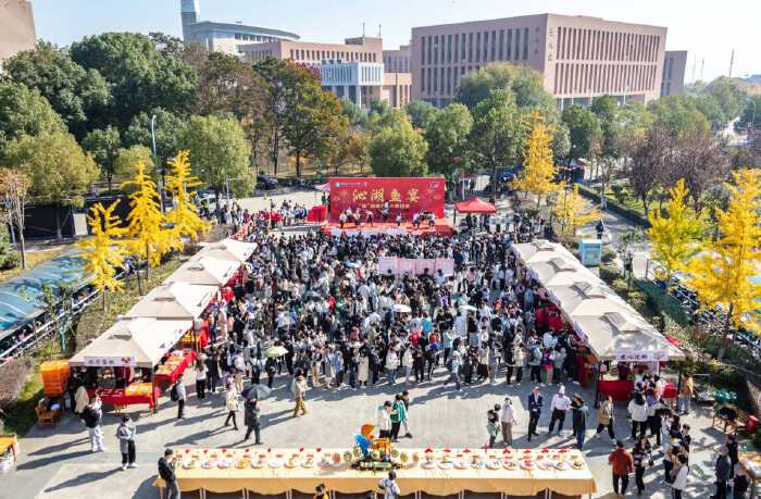 除了捕鱼吃鱼外,该校还推出了一系列与“鱼”相关的活动。在主干道两侧,有“沁湖鱼宴”“沁湖文化”图片展。学生身穿汉服展示中国传统文化,讲解美食文化等。