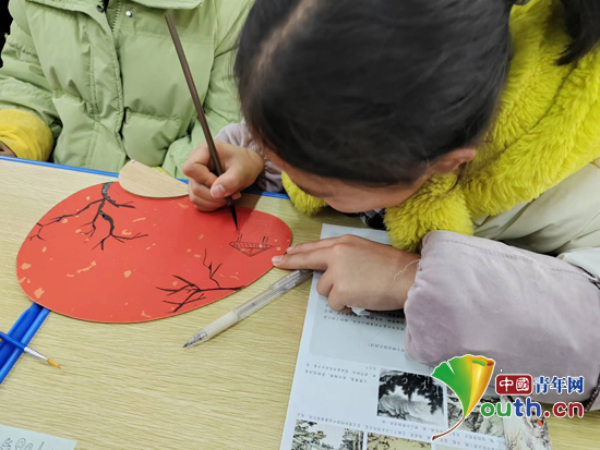 学生认真绘制团扇。武科大研支团供图