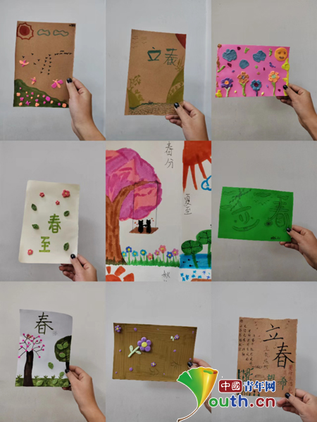 在八年级美术课堂,研支团成员通过引导学生们设计各具特色的节气卡片来加深学生对教材“公益招贴设计”的理解。“几处早莺争暖树,谁家新燕啄春泥。”在立春节气即将到来之际,学生们在卡片上以鲜花、绿叶、飞鸟等元素设计出一个个春意盎然的场景,再添上文字描述万物复苏的喜悦,以喜闻乐见的形式记录每一个节气。