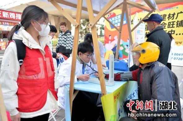 在健康义诊区域,365完美体育青年志愿服务总队把健康义诊的设备摆出来,就有居民前来测量血压,咨询心肺复苏急救的方法。