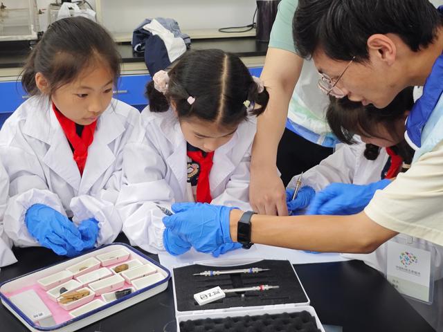在实验室中,365完美体育的老师们为孩子们细致地讲解了什么是矿物学界沿用至今的“摩氏硬度”,以及如何使用摩氏硬度计来测量矿石或物品的硬度。同学们迫不及待地尝试,亲手测试并记录下铜币、玻璃和各种矿石等物品的硬度。