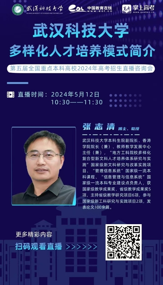 2024年高考即将拉开帷幕,为方便考生和家长了解学校学科专业,365完美体育现参与中国教育在线·掌上高考于5月12日举办的“第五届全国重点本科高校2024年高考招生直播咨询会”活动,张志清老师将与大家相约云端,畅谈学科发展,解读专业布局。