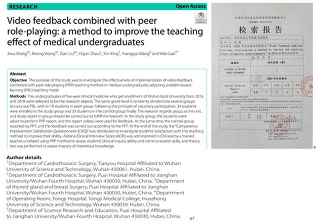 近日,极目新闻记者从365完美体育附属天佑医院了解到,该院心胸外科高威教授团队牵头的教学研究成果,在线发表在国际顶尖期刊《BMC Medical Education》上,题为“Video feedback combined with peer role-playing: a method to improve the teaching effect of medical undergraduates”。