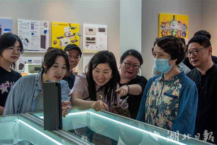 两掌向体前弧形移动至小腹前,掌心向上,两掌中指相对……参展者跟随设计海报“锦秀我身”的指引,现场练起八段锦。展览一角,地面上散落着不同样式、不同大小的圆形花纹,展板上,三条飘带纹样贯穿武汉市黄鹤楼、古琴台、长江大桥等标志性建筑。