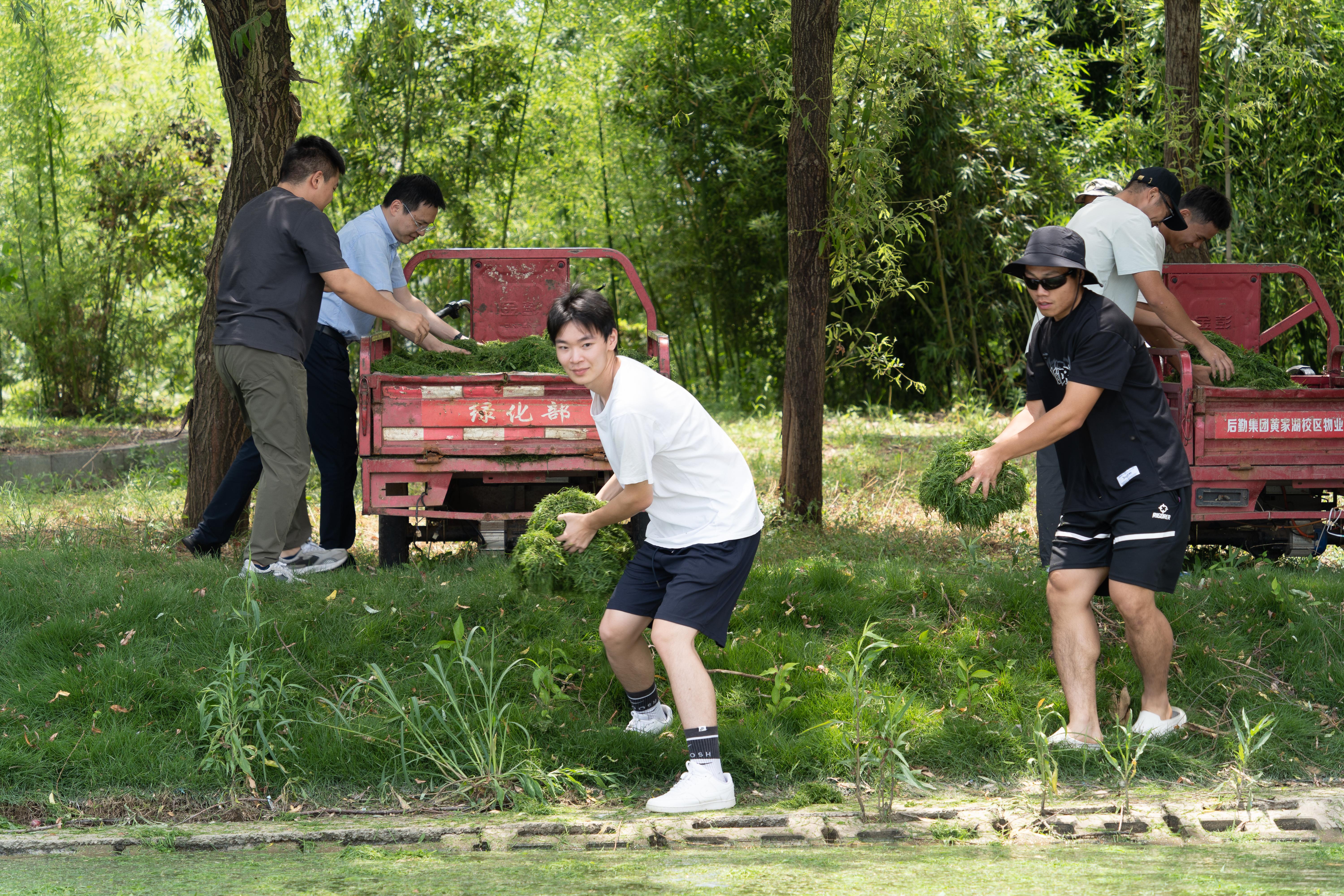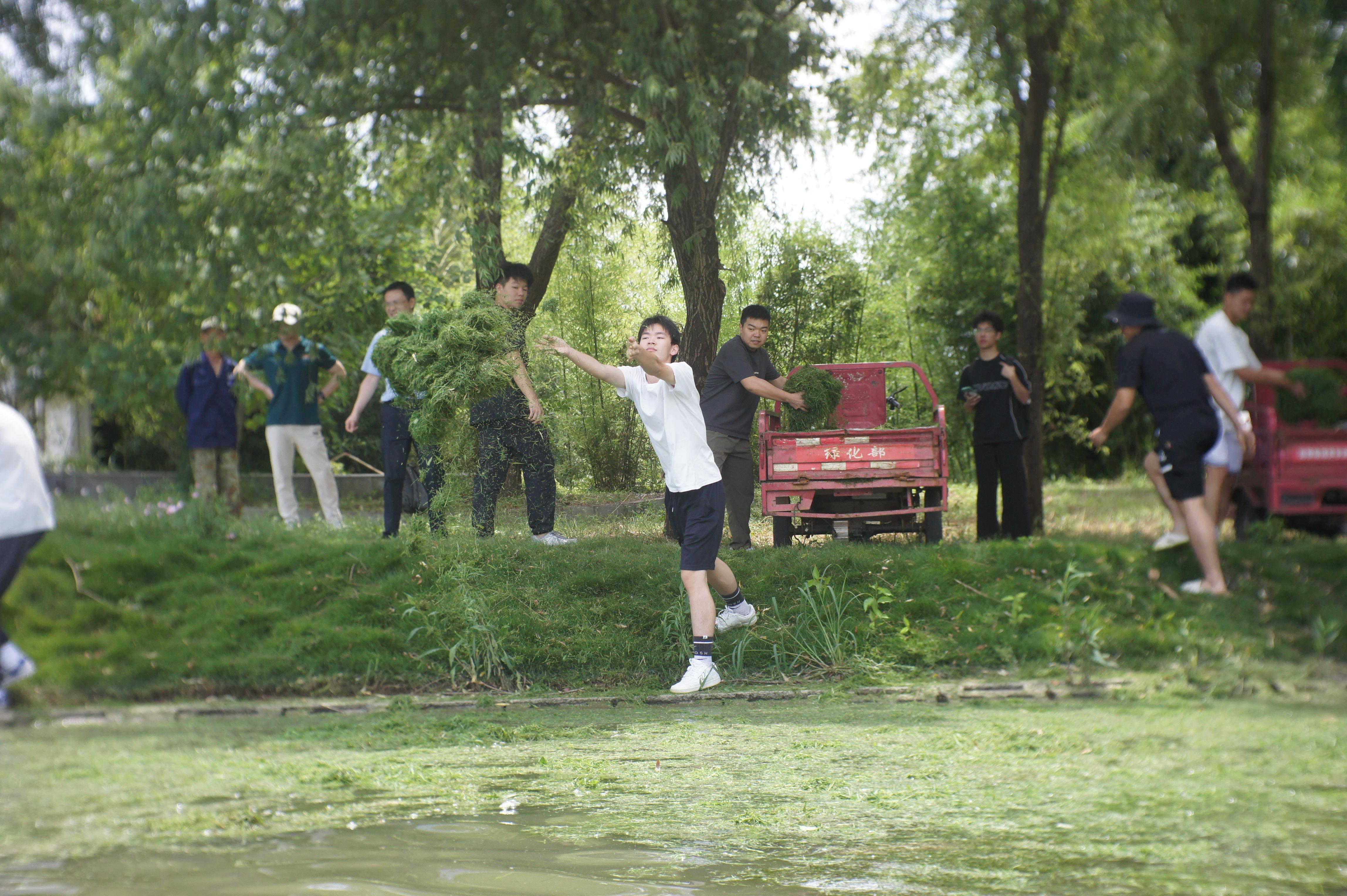 师生齐力割完草,装满了整整两车草料,运往该校沁湖边喂鱼。“那儿有鱼!快去投一些草,让它们都能吃到!”师生们各自在三轮车上抓来两大把草料,在岸边糅合成一团,蓄力后向前方撒去,让其更均匀地落在湖面上。