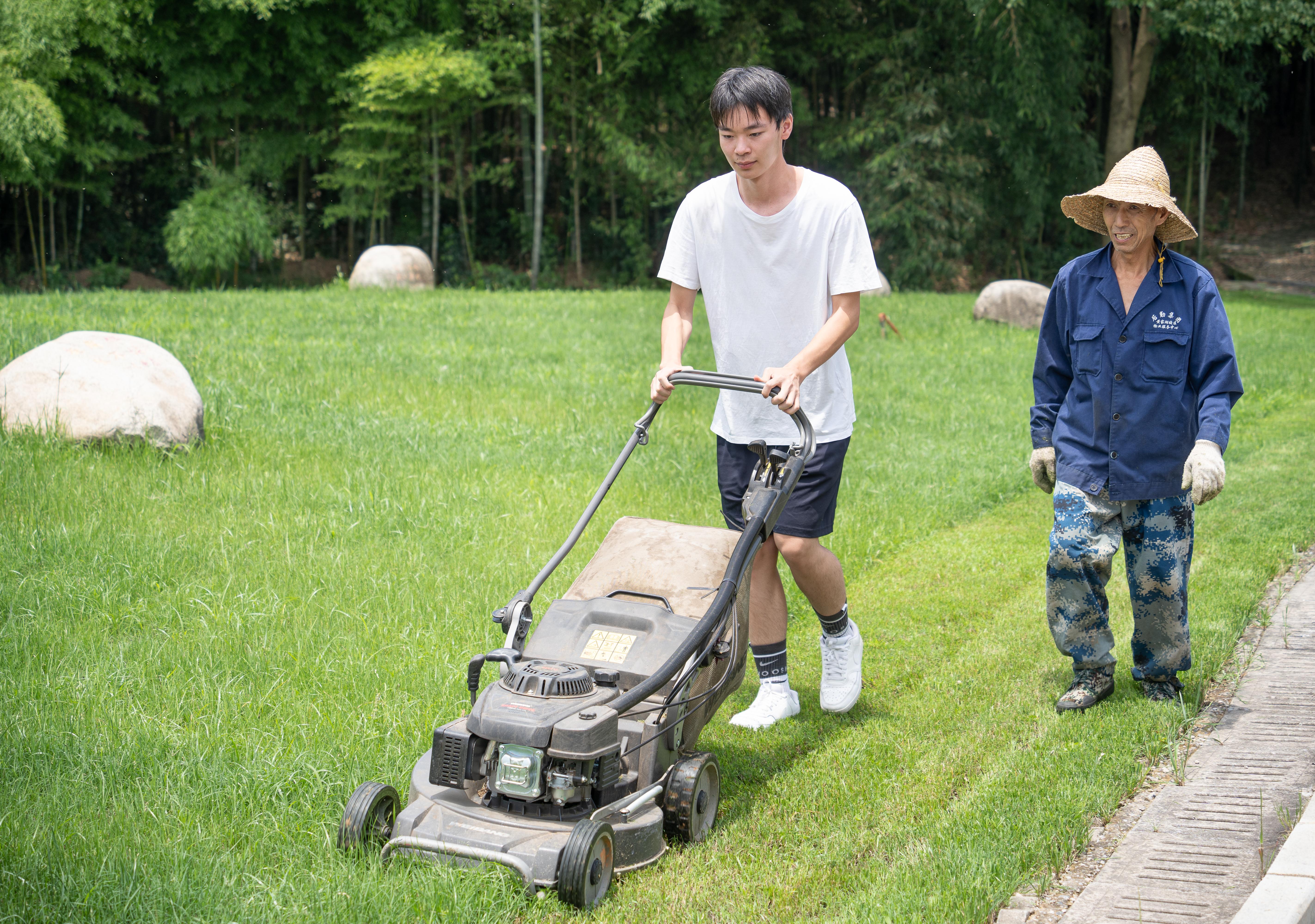 “拉动这里启动除草机,捏紧后把手机器就往前走。”体育学院2023级学生张新元在该校后勤集团职工的指导下,一把拉动油门线,伴随“嗡嗡”的轰鸣,开始控制除草机前行割草。一开始,除草机的路径歪歪扭扭,熟练后,他能平稳地推动机器割完一整圈的草。“学生们的干劲很大!我们也不要落后!”该校信息科学与工程学院2022级辅导员潘鑫一边操控机器,一边笑着说。