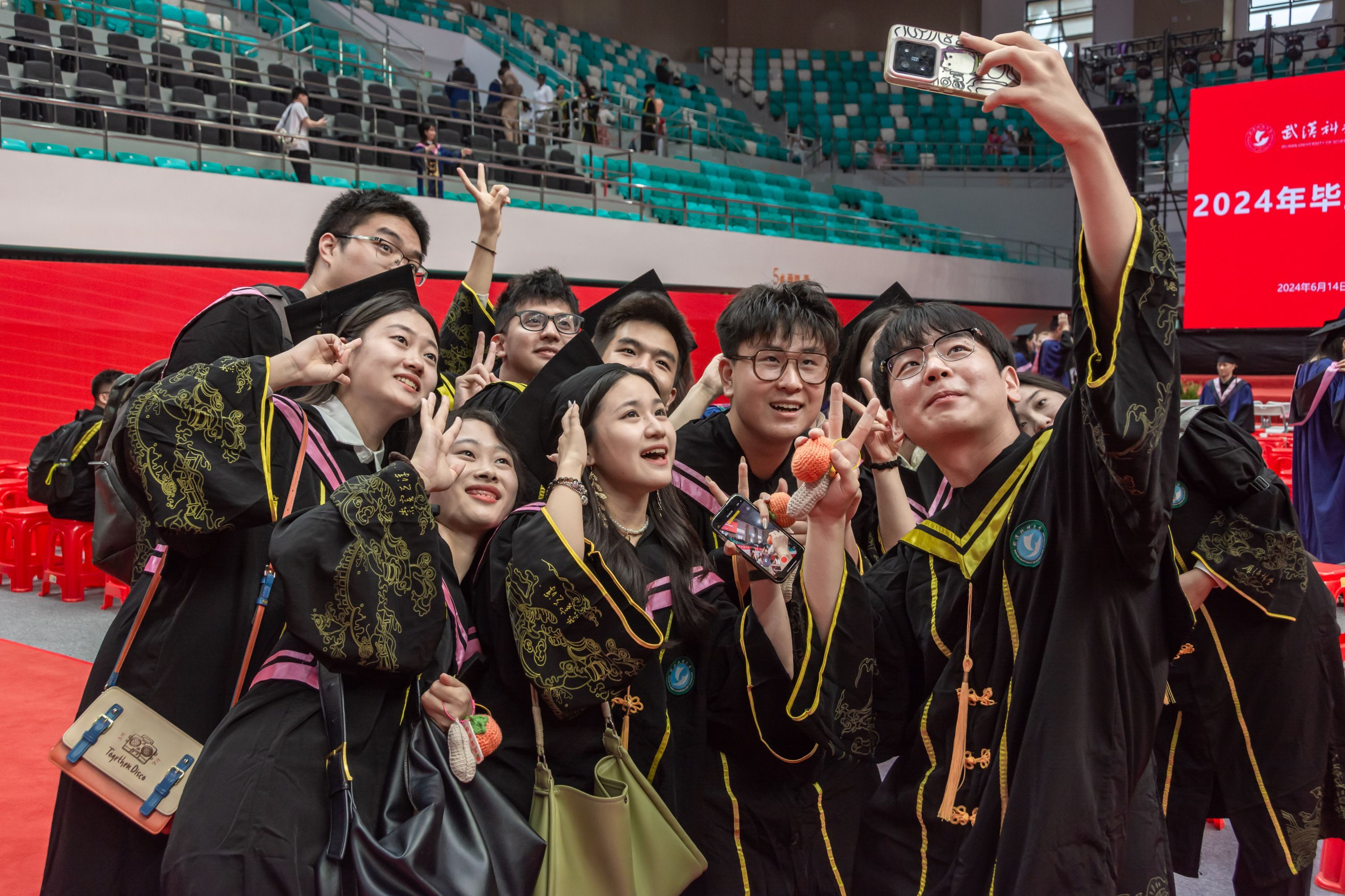 在毕业典礼现场,不少学生穿着马面裙改造过的学士服硕士服,戴着簪花帽,与老师同学合影留念。该校城市建设学院研究生梁傲松的父母从东北出发,坐了20多个小时的绿皮火车,“与儿子一同见证人生中的重要时刻”。