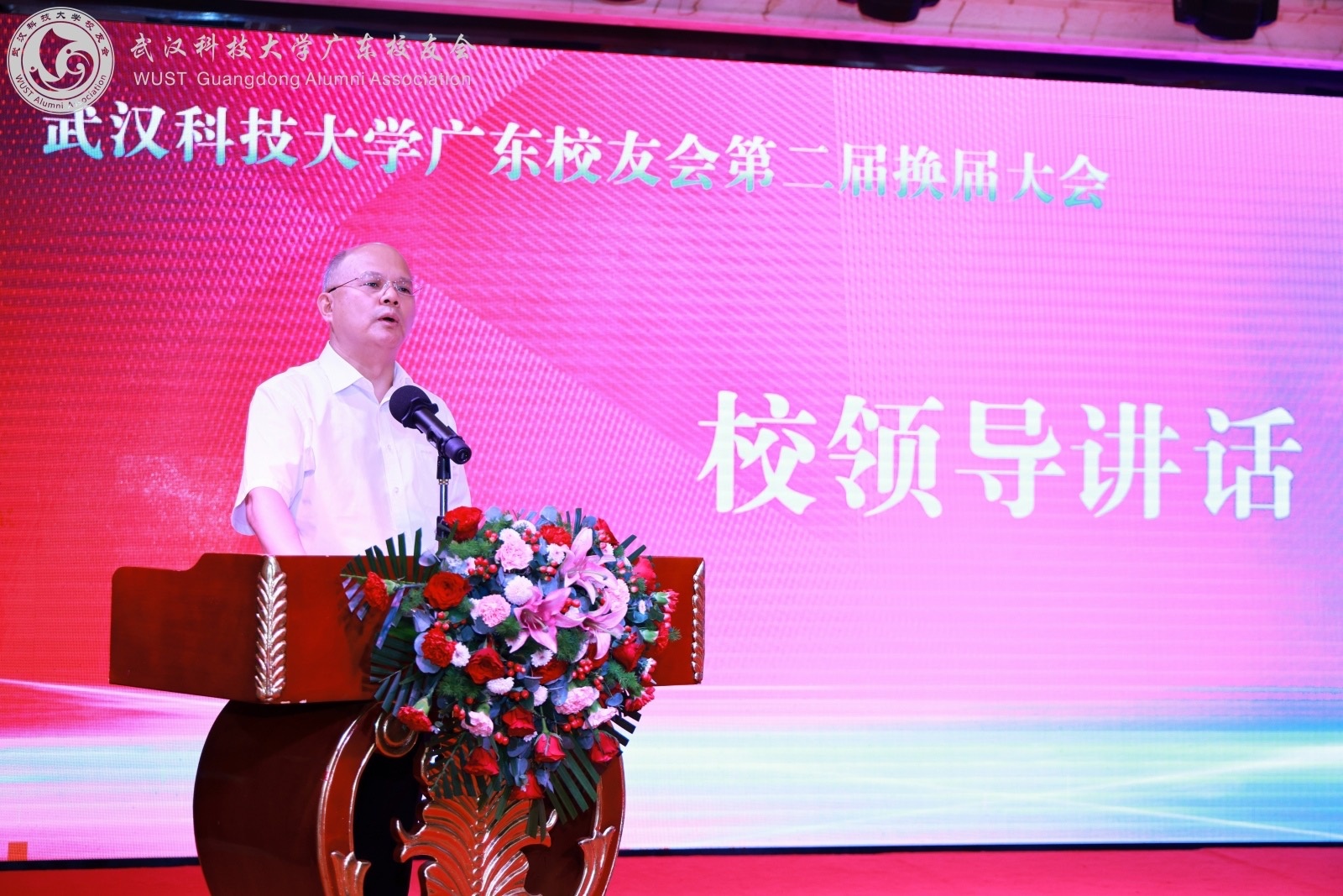 新一届理事会会长李烈军代表广东校友会第二届理事会致辞。他表示,广东校友会成功换届选举是一个新的开端,新一届理事会将不负众望,要积极团结广东校友,满腔热情地组织好校友,做好校友与校友之间、校友与母校之间的桥梁,通过学术研讨、文化交流、项目合作等多元化活动,服务好校友、服务好母校、服务好粤港澳大湾区高质量发展,主动融入本地经济、文化、社会、特别是科技创新的方方面面,积极投身到南粤大地处处充满生机的“百千万工程”中去,充分发挥武科大校友的“钢铁品质”,推动母校与校友共同发展,不断深化鄂粤两省合作,加强两地联动,通过融合发展成为高质量发展的新动能,为大湾区的创新发展贡献智慧和力量,为国家作贡献,为社会创造财富和价值,为母校增光添彩。