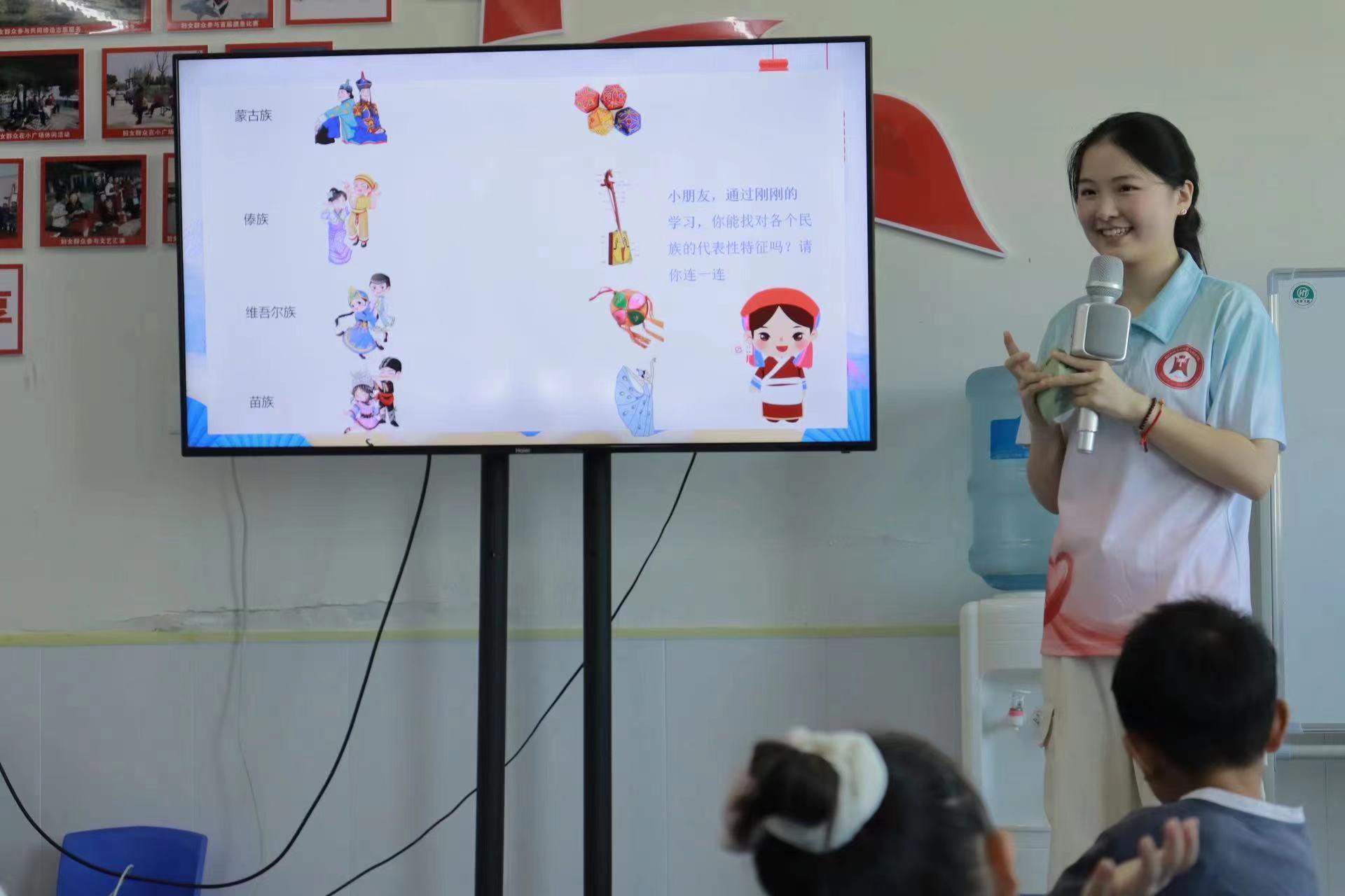“声韵童年”课堂上,“爱之星”支教团成员王子怡用湖北荆门方言开场,展示方言交流的障碍,带领小朋友们说好普通话。民族主题教育课堂上,支教团成员谢秋迪由石榴籽引出民族团结,向小朋友们具体介绍了中国少数民族的基本情况。“五十六个民族凝聚在一起就是中华民族共同体!”小朋友纷纷说道。