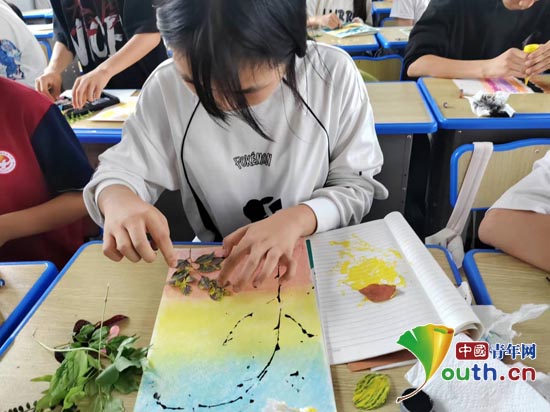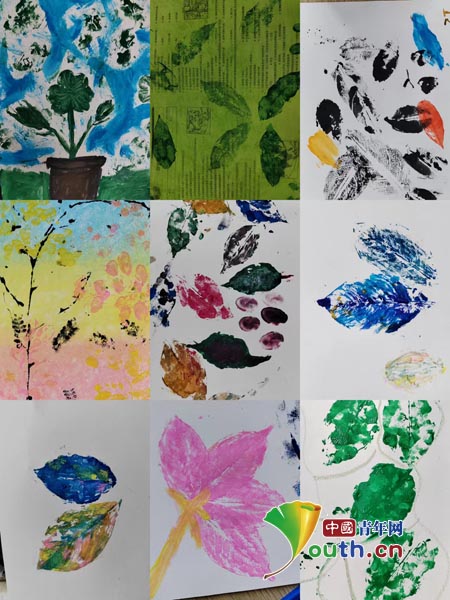 随后,学生们用颜料和树叶拓印出一幅幅既色彩绚丽又充满夏日活力的图画。他们还在图画上添加了人物、动物、树干、花朵等,使拓印作品的内容更加丰富多彩。