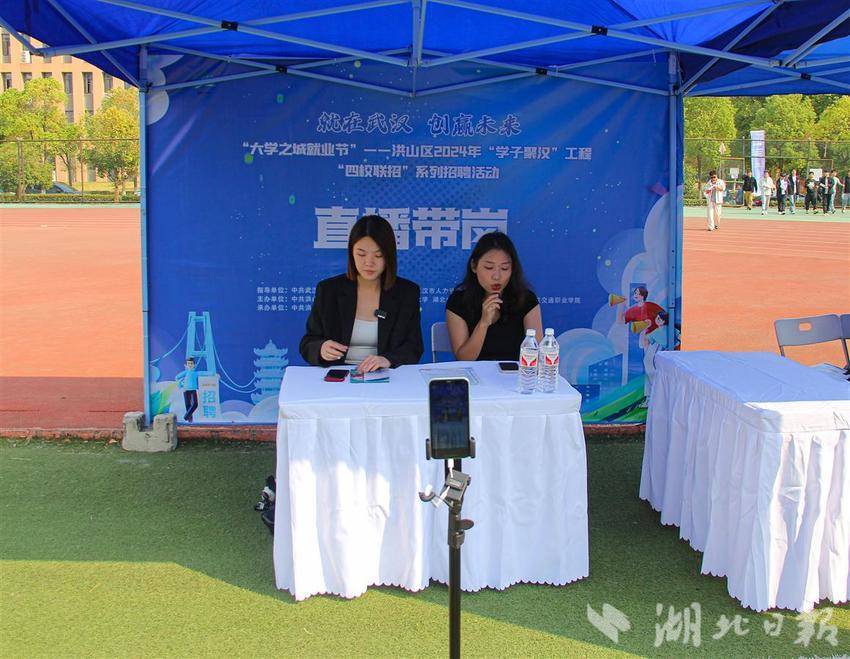 招聘会现场设有直播带岗区,由专业人员直播讲解企业信息,提供线上招聘渠道。此外还设有“留汉”政策服务专区,供前来求职的学生了解和参考。