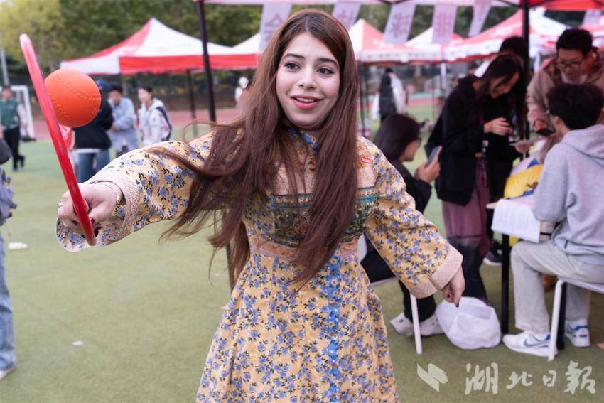 来自巴基斯坦的Anshrah曾练习过太极,一早她就来到社团体验:“太极柔力球动作快的时候得避免掉落、慢的时候就需要发力,非常有趣。”