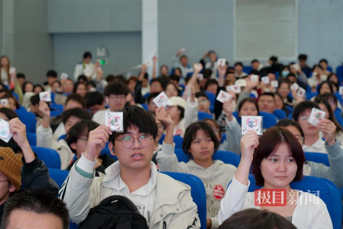同学们举起了“热血信物”——“热血新青年”徽章(覃宇杨璨摄)