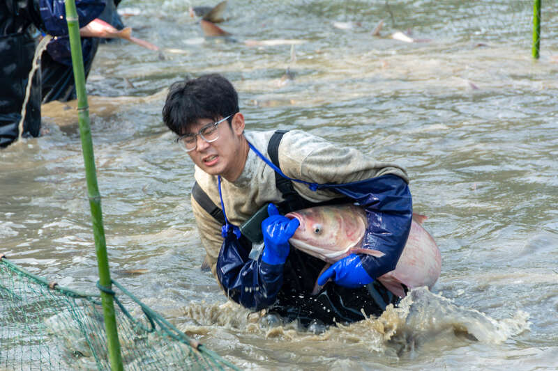 16岁的外国语学院大一新生刘好好在岸边为鱼称重,看着一条条少见的大鱼被搬到称台,她感到十分新奇:“太热闹有趣了!鱼都好大!有口福了!”