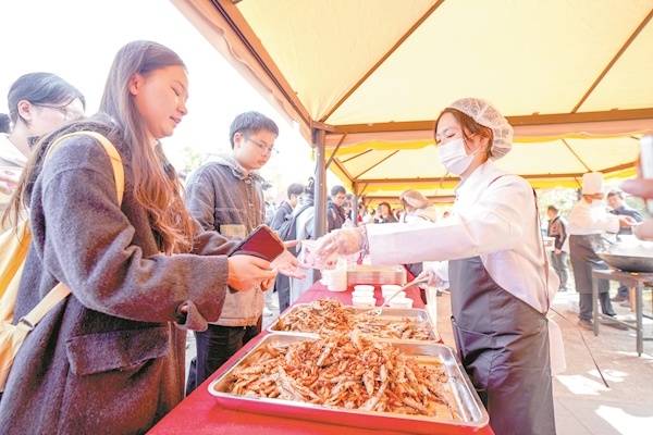在南园餐厅门前,各类菜肴展示和特色小吃组成的小庙会吸引学校师生排起了长队。来自学校各个餐厅的大厨们各显神通,以新鲜的沁湖鱼为主材,精心烹制了21道融入126周年校庆元素的菜品。