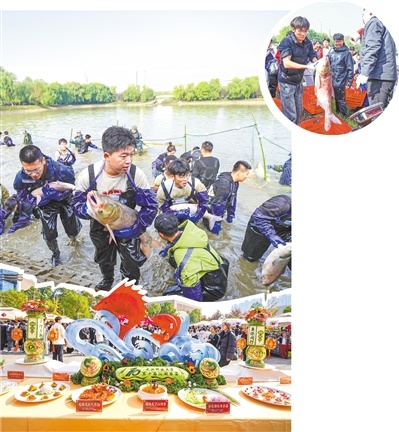 今年鱼宴捕鱼环节还有不少女生参与捉鱼、称重。马克思主义学院首届大一新生郭如玉第一次下水捕鱼,在岸边观众的喝彩声中和师生的鼓舞下,她牢牢抱住大鱼划开水浪成功上岸。“很有挑战的一次体验!大家都在为我们加油,我也尽全力成功捕到鱼,非常开心!”