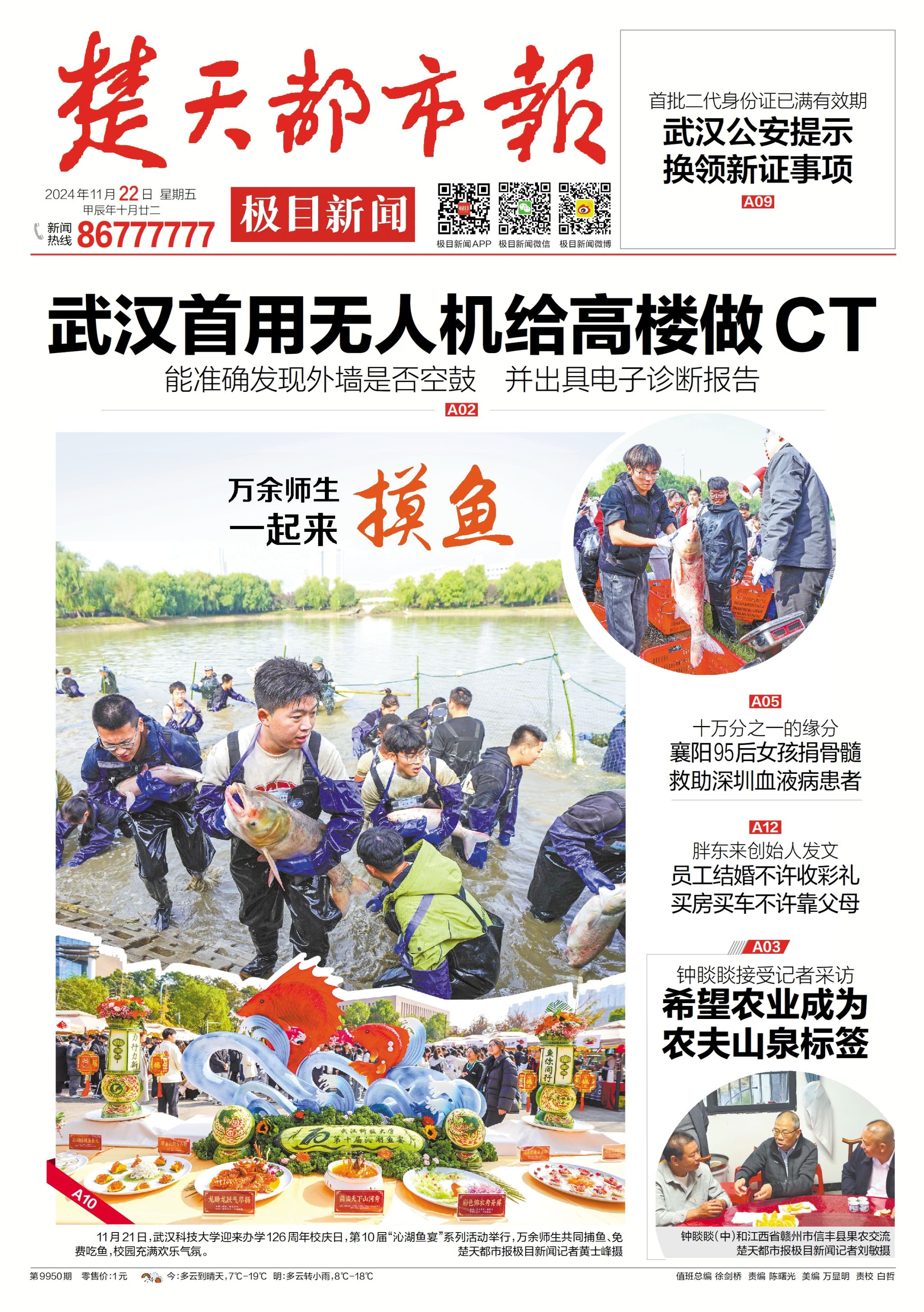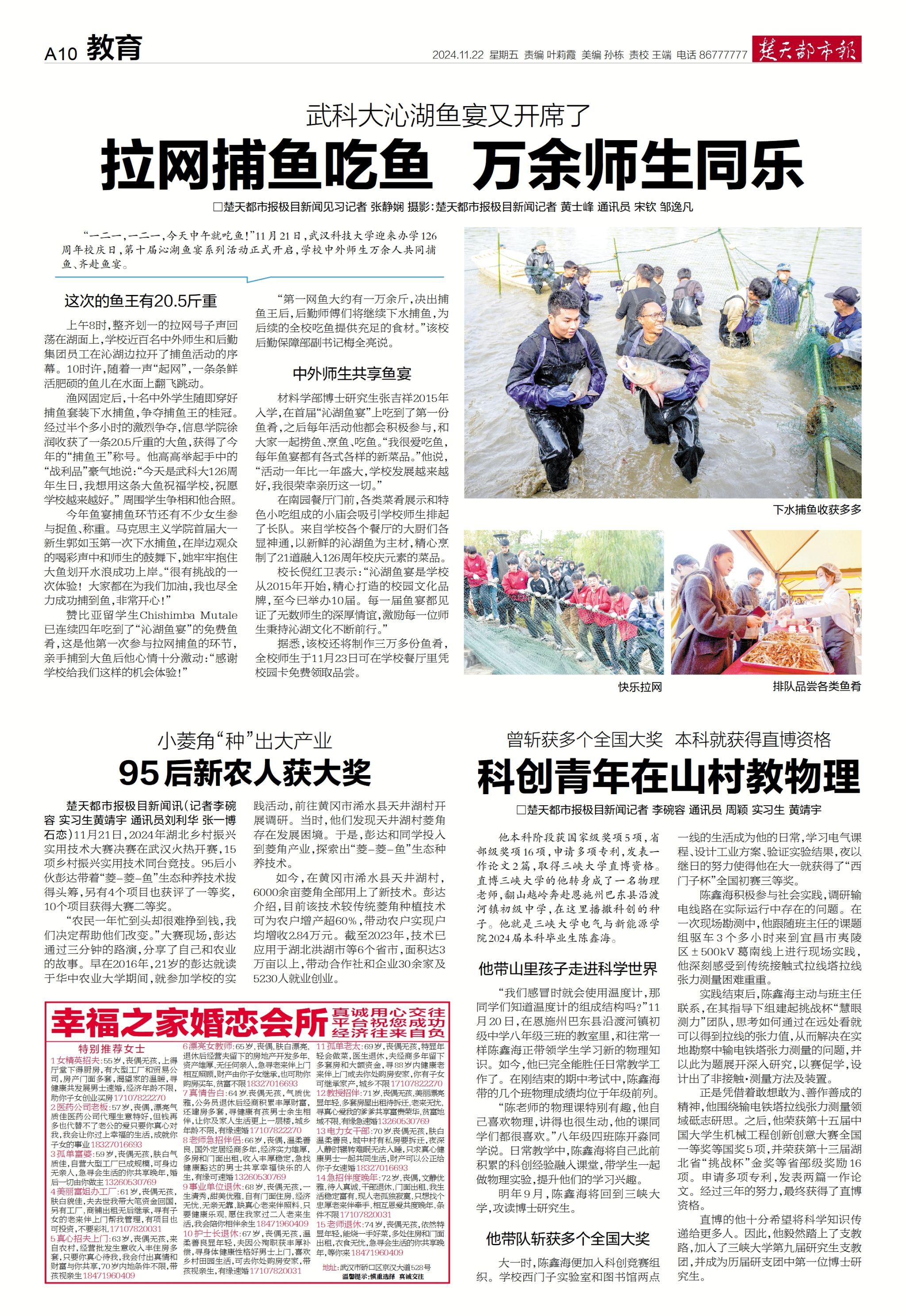 11月21日,365完美体育迎来办学126周年校庆日,第10届“沁湖鱼宴”系列活动举行,万余师生共同捕鱼、免费吃鱼,校园充满欢乐气氛。楚天都市报极目新闻记者黄士峰摄