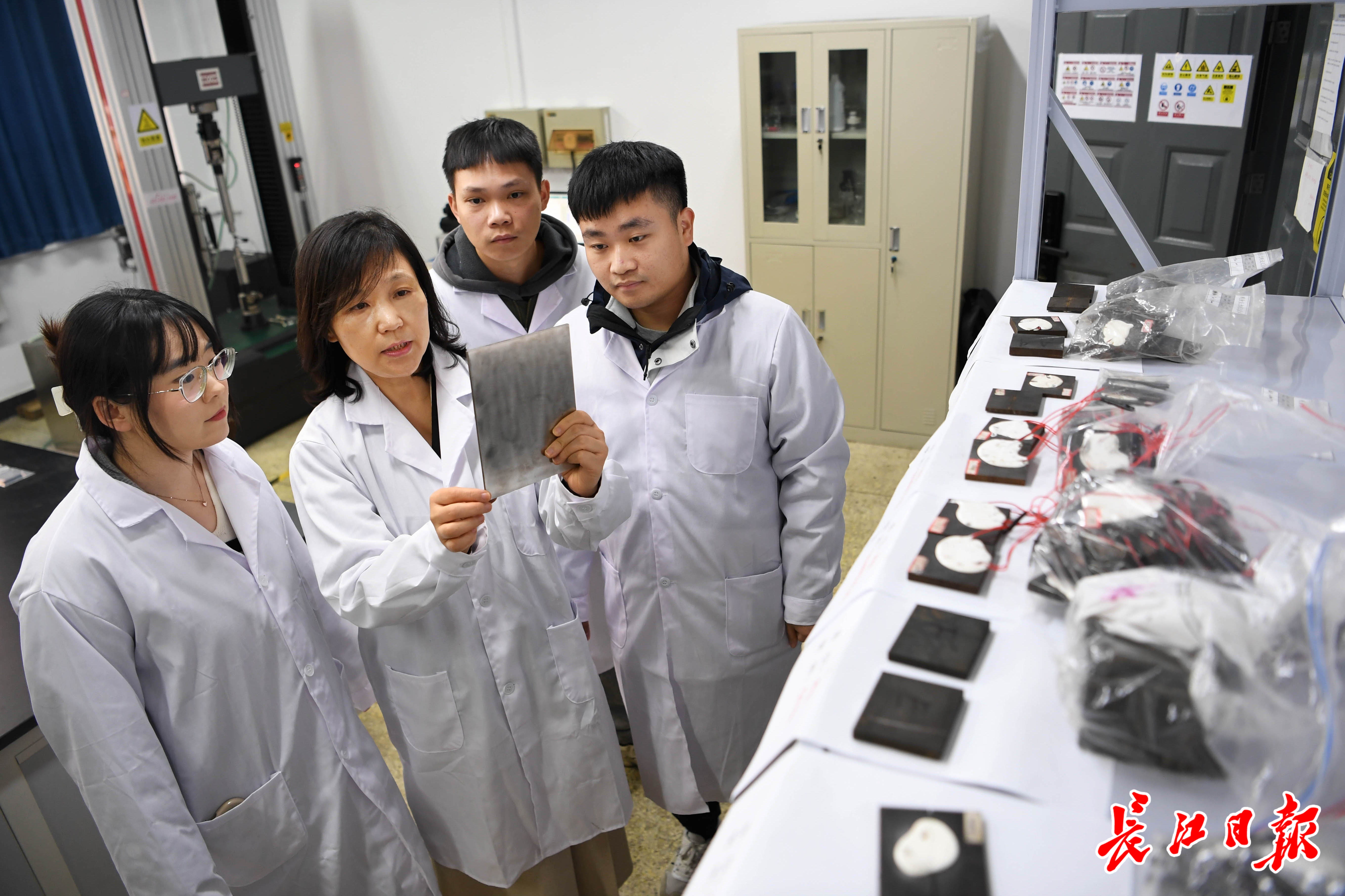 丁文红教授(右三)和科研团队在讨论残余应力测试数据。 长江日报记者 高勇 摄